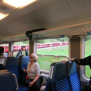 今回は新婚旅行でイタリアをメインに旅行したのですが、ミラノから日帰りでベルニナ急行に乗れるということで申し込みました。往路のサンモリッツまではとてもわかりやすい案内をいただけるので、迷わず楽しみながら行くことができました。サンモリッツではピッツネイル展望台に行きたかったのですが、オフシーズンらしくケーブルカーが動いておらず残念でした。またレストランやショップもほとんど閉まっていたので、時間を持て余してしまいましたが、のんびり散歩をしたり(歩いていないと寒いです!!)、景色を楽しんだりして過ごしました。ベルニナ急行はとても素敵で、はじめは雪景色、しだいに新緑がきれいなグリーンの景色を満喫することができたので、早起きしてこの日帰りツアーに参加した甲斐がありました。