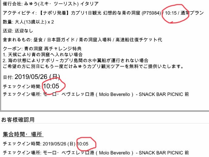チェックイン時間とされているのは、10:05分、そして、バウチャーには、10;15と表記があり、あたかも10:15分に出発するかの様な錯覚を覚えさせます。しかし、実際には、ナポリ滞在組は、ローマからの合流組を待ち、たっぷり一時間以上、船着場で待たされる事になります。結局乗船は11時11分でした。他社のツアーのスケジュールは、9時集合と早いですが、10時にはカプリ島に到着とあります。
