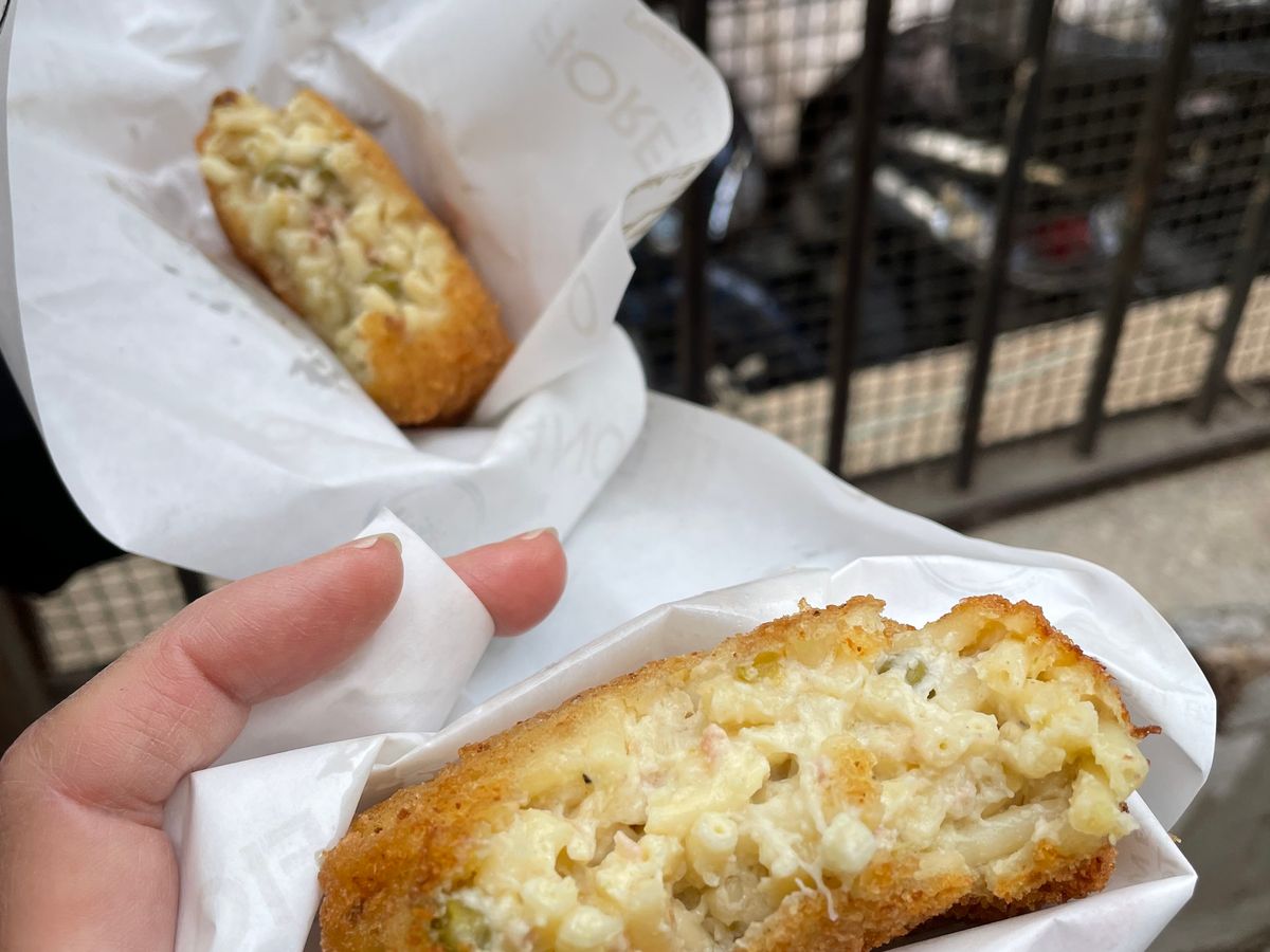 スパッカナボリの混み合うストリートでも、初スパゲッティコロッケ、揚げピザを食べました。どちらもとても美味しかったです。
