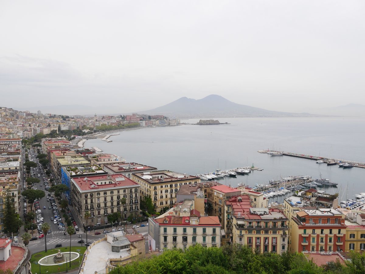 彼のプランに従って、ホテルを出てまずはヌオーボ城へ。その後サンカルロ劇場、王宮などを解説とともに巡りプレビシート広場近くのカフェ・ガンブリヌスの説明、プレビシート広場とそこに立つ2人の銅像のエピソードなどをきく。それからサンタルチアの方に歩いて卵城の説明とその先にあるカフェやレストランの案内。その先のサンタルチ海岸を歩き色々と話を聞く。それからタクシーにてポジリポの丘へ。このあたりは高級住宅街とのこと。ポジリポの丘からは世界3大夜景といわれるうちの一つであるナポリの夜景が見られる場所で、昼間でもナポリ市内とベスビオ山が一望できる場所だった。再びタクシーでサンタルチアに戻り、キアイア地区を歩いてトレド通りに戻ることに。トレド通りに着く前に美味しいレストランを紹介してくれた。