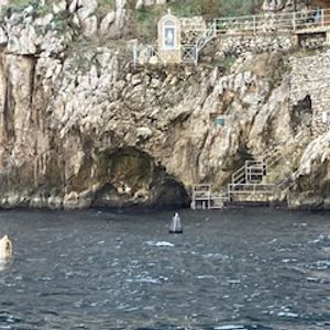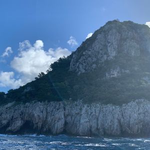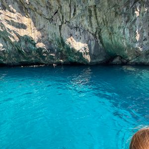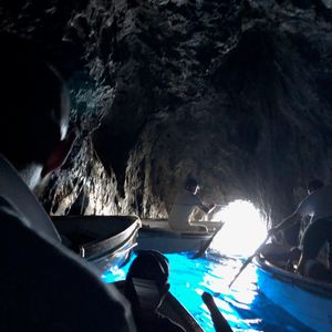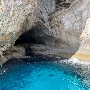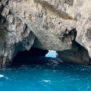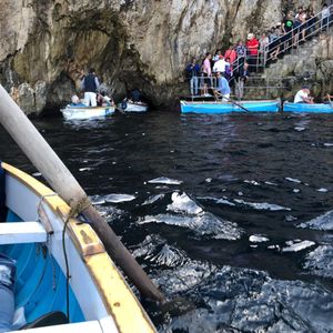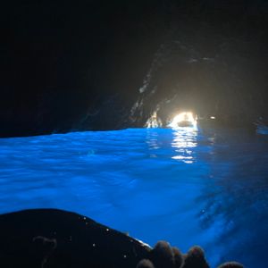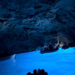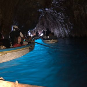 カプリ島に渡りそこからまた小さい船に乗り換えて15人前後で洞窟近くまで行きました。直前まで洞窟の中に入れるかどうかわからないとのことでした。洞窟の前には何艘もの船が待っていました。船にゆらゆら揺られなが1時間少し気持ち悪くなりました。酔い止めの薬を持ってくればよかったと後悔しました。そこからさらに1時間もう少しで吐くかも・・と思っていた時順番が回ってきました!更に小さい船に乗り換え洞窟の中へとてもキレイな青い色!!夢にまで見た「青の洞窟」でした。あっという間の短い時間でしたがいままでの人生で見たことのないキレイな青色でした。そのすぐ後のランチは気持ち悪くて食べられませんでしたがデザートのレモンヨーグルトはサッパリしてめちゃくちゃ美味しくいただきました!私たちは運良く洞窟に入れましたがすぐ後からきた船の方たちは水位が上がり入れなかったみたいです。