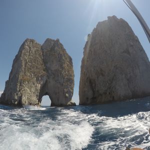 そんな思いをして到着したのに、ガイドさんからまさかの『波が高いので今日は残念ながら青の洞窟には入れません』と…。天気は良いため、代わりにカプリ島周りをクルージングに変更になりました。