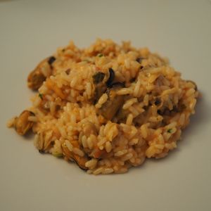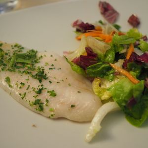 ここでの昼食メニューは、魚介類のリゾット、白身魚のソテー、サラダ、レモンシャーベットとなります。
