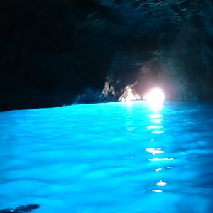その後、10人乗りくらいのモーターボートに乗り換えて、青の洞窟へ。さらに4人が乗れる小舟に乗り換え洞窟内へ。あまり待つこともなく洞窟に入れました。洞窟内の青い光にあふれた水の反射に感激。お決まりの船頭さんの歌も楽しみました。