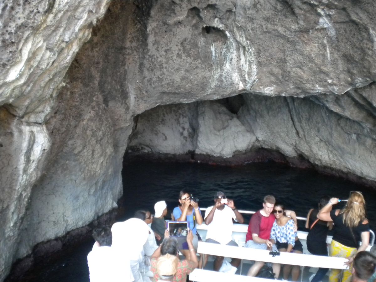 小型船は結構ゆれます。今回、1時間以上洞窟の前で待ちました。船酔いする方は注意が必要です。小型船から小舟に乗り換えて洞窟内へ入りますが、小舟の中が結構濡れてました。その中で姿勢を低くするために寝転がるので、それなりの格好で行くのがよいと思います。洞窟の中での滞在時間は5分程で、船頭さんが歌いながら洞窟内をぐるっと一周してくれました。レストランでの食事は見た目パッとしませんが、味はおいしかったです。特に最後のレモンシャーベット。帰りはバスのエアコンの調子が悪くなり、当日暑かったので熱中症が心配でした。