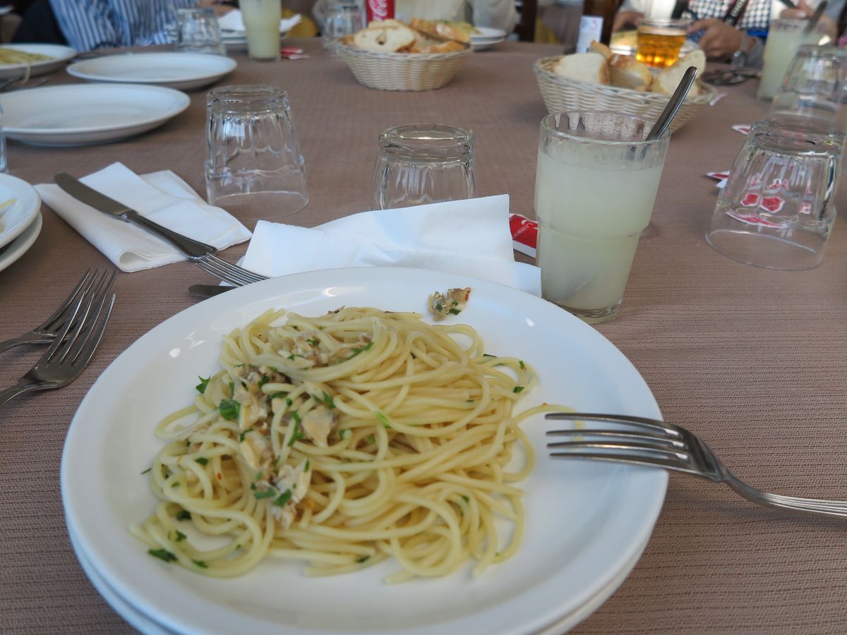 ですが、昼食一皿ずつパスタがこず、まとめてパスタを配る形式だったため私と母の皿にはボンゴレパスタなのにほとんど貝入っておらず、隣のお姉さんは貝だらけでした。せめて一皿ずつの選べるパスタにしてほしい。塩味もあまりなく味のないパスタでお腹空いてたから食べたけど。レモンジュースもレモン汁と水を足して2で割ったような代物で美味しくない。これで4ユーロ、レモンジュースは飲まない事をおすすめします。デザートこそはとちょっと期待したチョコケーキもパサパサのケーキで微妙。食事風景は静かで皆さん気まずい、とりあえずお腹空いてたから食べるという感じでした。ウェイターさんが美味しいですか?という感じで聞いてきたが気を使って美味しいとは言いましたが…。食事は期待しない方が良いです。それ以外はスゴく満足です。