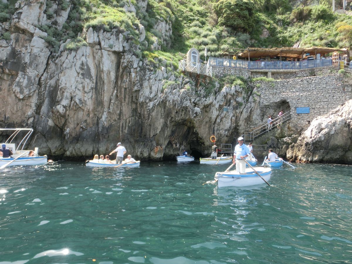 ローマから参加して、帰りはナポリで離脱しました。参加当日の朝、ローマは雨だったので心配していたのですが、ナポリに着いたら晴天。まず大きな船に乗ってカプリ島へ。そしてクルーザーのような船に乗り継いで洞窟前まで。そこで小舟に乗り換えて洞窟内へ!神秘的なブルーが洞窟内の海水を満たしていて、とっても感動しました!お天気にも恵まれて、洞窟前に早目に到着できたことで待たずに小舟に乗れて、すんなり洞窟内へ入れたのでとてもラッキーでした。ガイドさんたちも一生懸命サポートしてくださいました。カプリ島の散策も楽しかったです。
