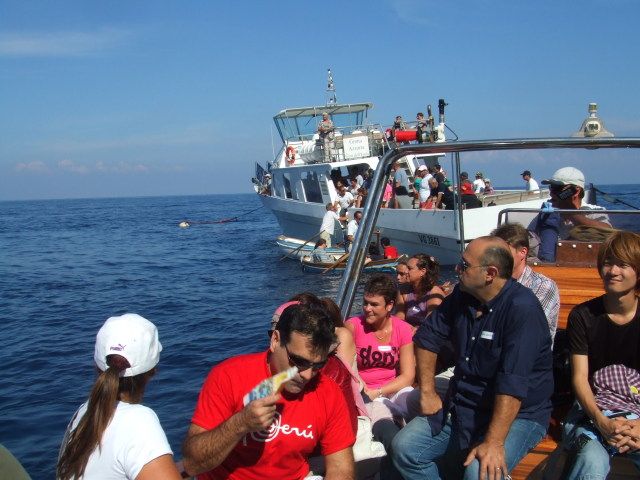 カプリ島から洞窟に向かう船に乗る時、ガイドさん?の力量で乗る順番が前後する。やり手は強引に先に行く感じで早々乗り込み開始。この時間差は後でかなり影響する。