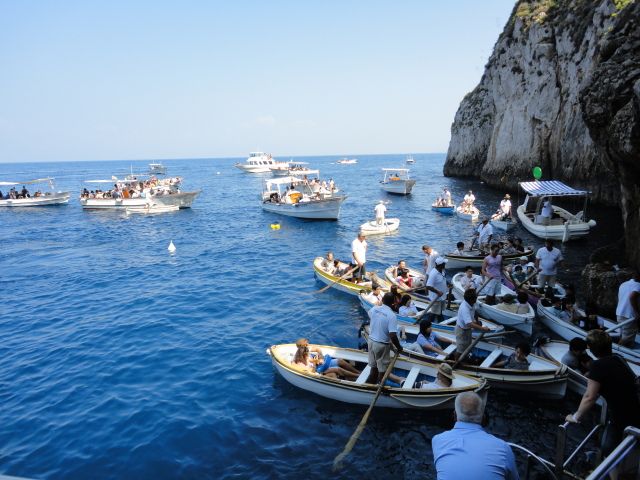 本当は禁止らしいが洞窟内で泳いでいるグループあり。相当のチップをはずんだか?5~6隻の手漕ぎボートが洞窟内を2~3週してくれる。泳ぐやつがいると危ないよね。ボートの船頭はご機嫌にオーソレミーオなんか歌ってチップ2ユーロをいただいちゃう感じ。乗り降りや暗闇にまぎれて若い女性の胸やおしりを触っちゃう怪しい船頭もいるようで・・。