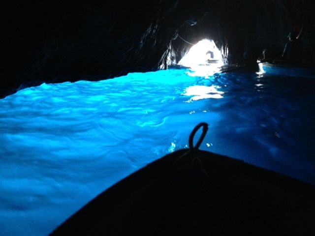 前日までは曇り空、青の洞窟に入れるかどうかとても不安でしたが、当日はすっきりとした快晴。でも、添乗員さんは、間際まで入れるかどうか教えてくれませんでした。(入れなかったときの事を配慮して、ですね)。カプリ島に着くとボートに乗り換え、その後、手漕ぎ船へ。約1時間ほどで中に入ることができました。(もっと待つときもあるようです)テレビで見た以上に青い色が濃く、とてもきれいでした。