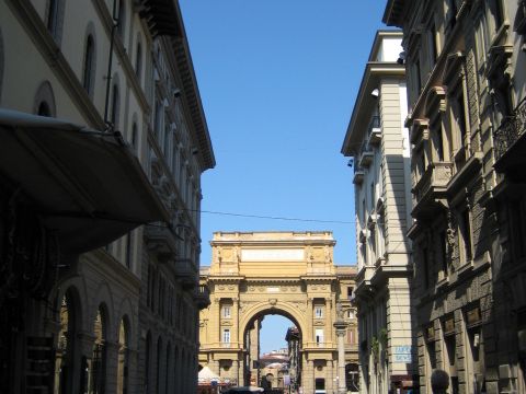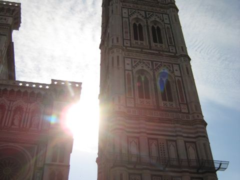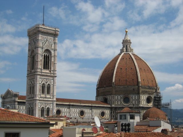 ローマから朝6時半ころのユーロスターに乗り、いざ!!フィレンツェへ!!車内通路を挟んだ隣に座っている日本人カップル発見!!「ひょっとしてこの人たちも・・・」と思い声をかけたら、案の定同じツアー♪しかも、私たちと同じ新婚旅行者~♪電車の中から盛り上がりました♪フィレンツェ到着。集合時間まで時間があったので、マックカフェでカプチーノ買い~の、駅前の芝生になっているところで一服♪鳩にクッキーあげてまったり♪9時ちょい前、集合場所のADUA広場へ。到着してからのこのゆったりした時間がまたよかった♪ガイドは日本人のイトウさん♪フィレンツェの歴史など丁寧な説明を聞きながらドゥオーモまで歩きました♪。イトウさんの聞きやすい説明、感動しまくりました♪イタリアの歴史をもっと知りたいと思いました。