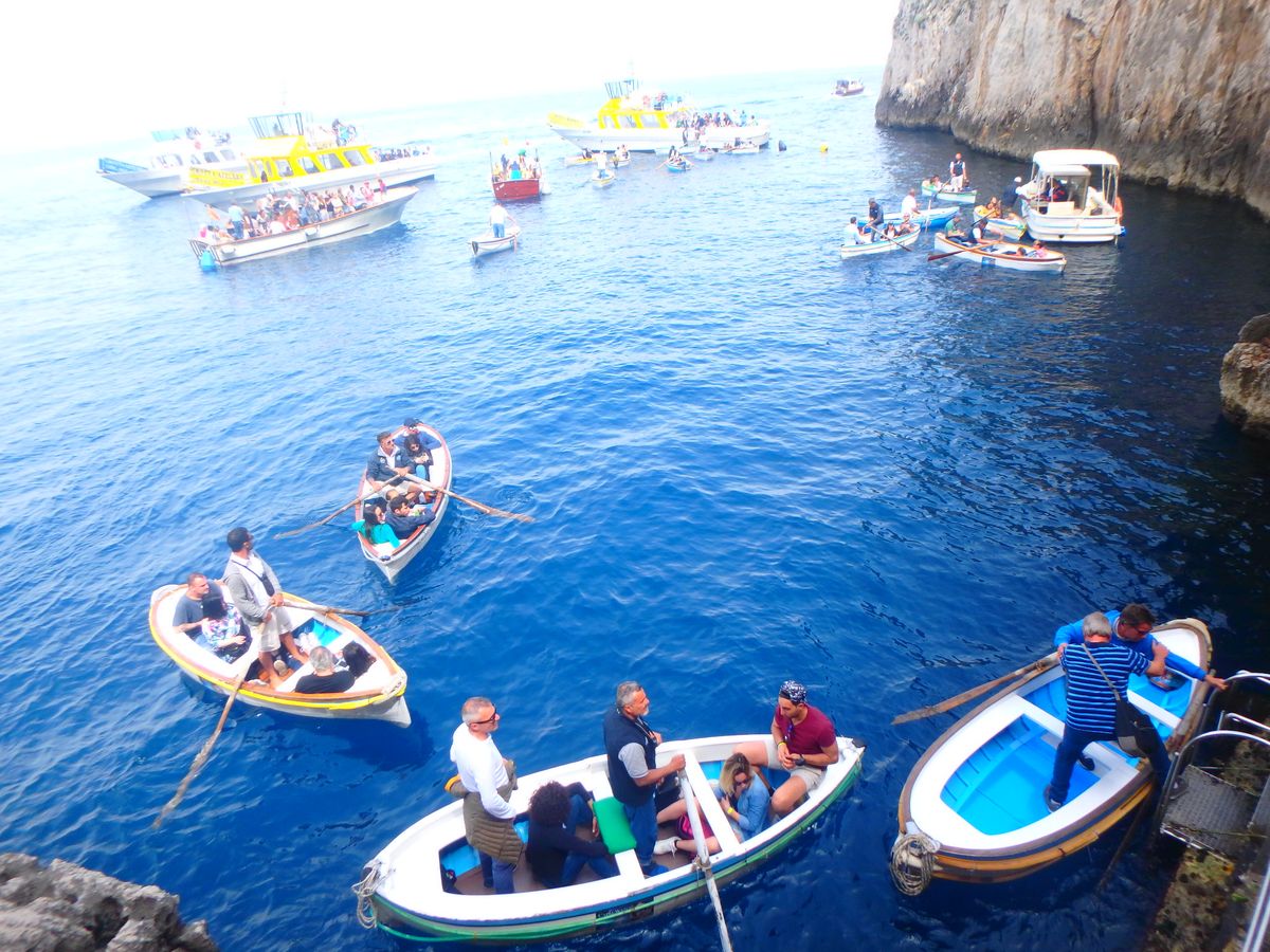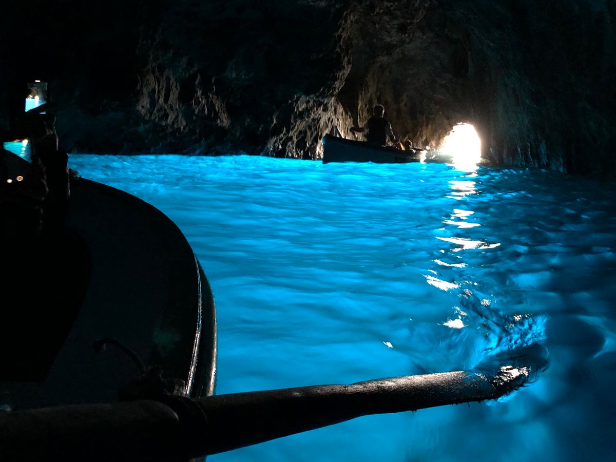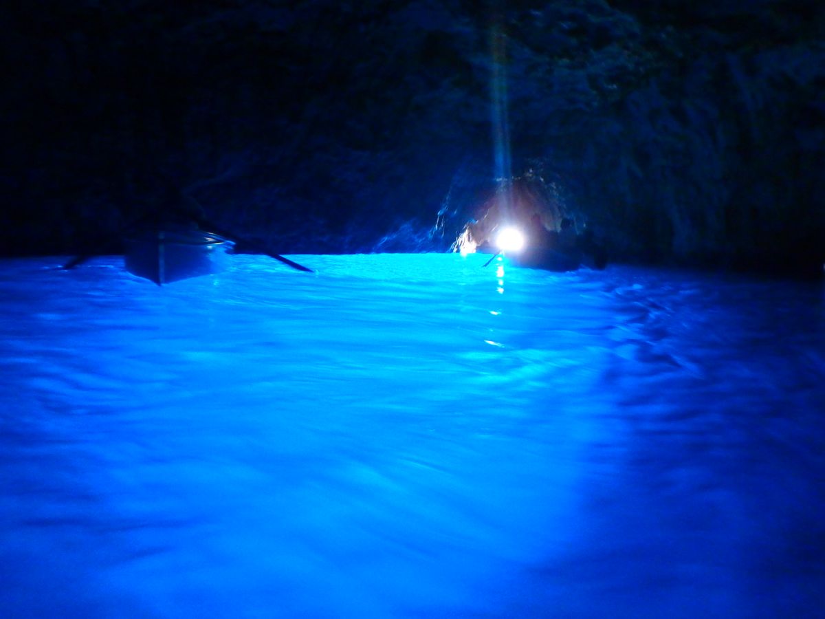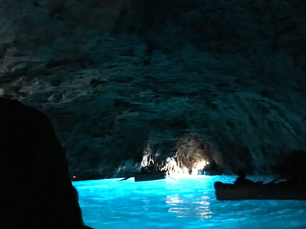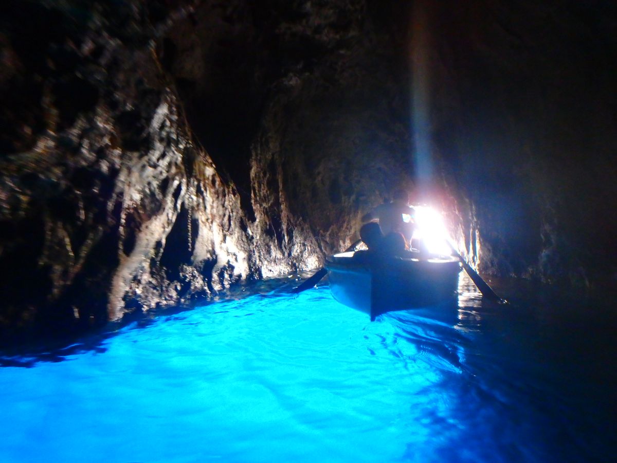 青の洞窟は小雨が降り始めるも、無事に入ることができました!船頭さんへ、洞窟へ入る前に二人で10ユーロ支払ったところ、「ユックーリユックーリ、サービスサービス、スペシャルチップ」と追加をねだられつつ、中で3週程度回ってくれるなど長時間洞窟内にいれました。30名程度のツアーで最初に乗って、最後に戻ってきたほどです。(一緒になった他の日本人も後で20ユーロ、こちらも追加で5ユーロ出してるので、かなりの金額です)1-2ユーロでも、とガイドの方は言われますが、長くみたい方は最初にしっかりと金額を見せて、ゆっくり回って欲しいなどのリクエストをすると良いかと思います。ミツシタさんから、「イタリアはチップの金額で態度が180度変わる。いいサービスを受けたいなら払うこと」、と言われましたがその通りだと実感しました。