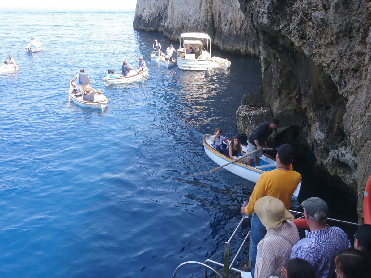 夏は入場可能率が高いがピークの時期で人数が多いので待ち時間が2時間以上かかるときがある、逆に冬は人数は少ないが入場できる確率がとても低い、と聞いていたので春の気候が落ち着いたころを狙って参加しましたが、大正解でした。アナカプリから階段を下って小舟に乗りました。この階段もピーク時は人で溢れかえるとのことでしたが、今回は私たちのグループ(15名ほど)しかおらず、小舟に乗ってからも5分ほど待つとすぐ入場できました。