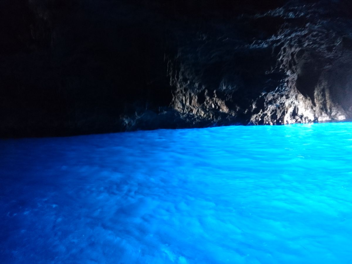 洞窟の入口は波もありますが1メートルもない小さな穴なので、入る時はボートに座るのではなく寝そべってくれとジェスチャーで指示があります。洞窟の中に入っていたのはだいたい3分~4分くらいで、写真や動画ばかりを撮っていると、肉眼で見て目に焼き付ける時間がないのでその点はどうぞバランスよく…。
