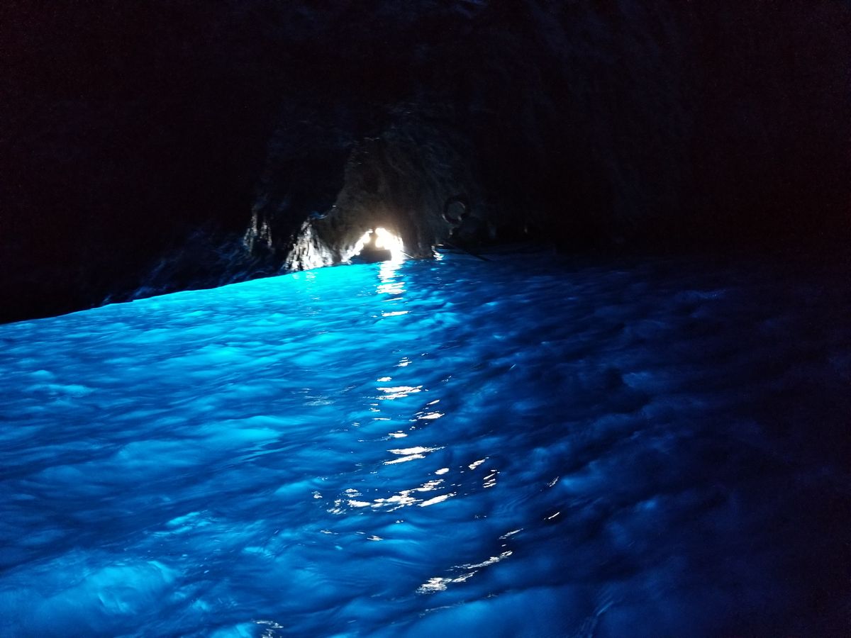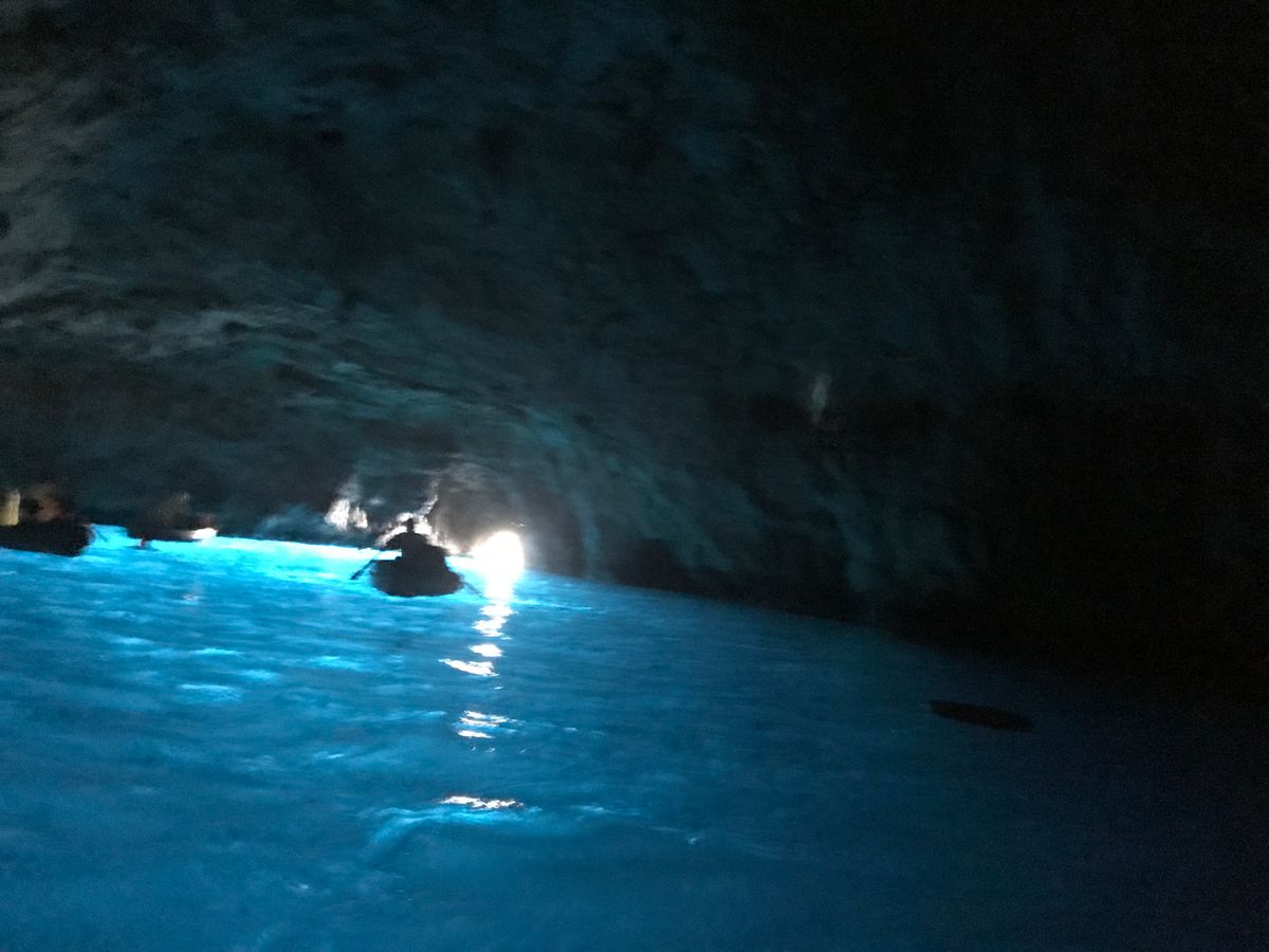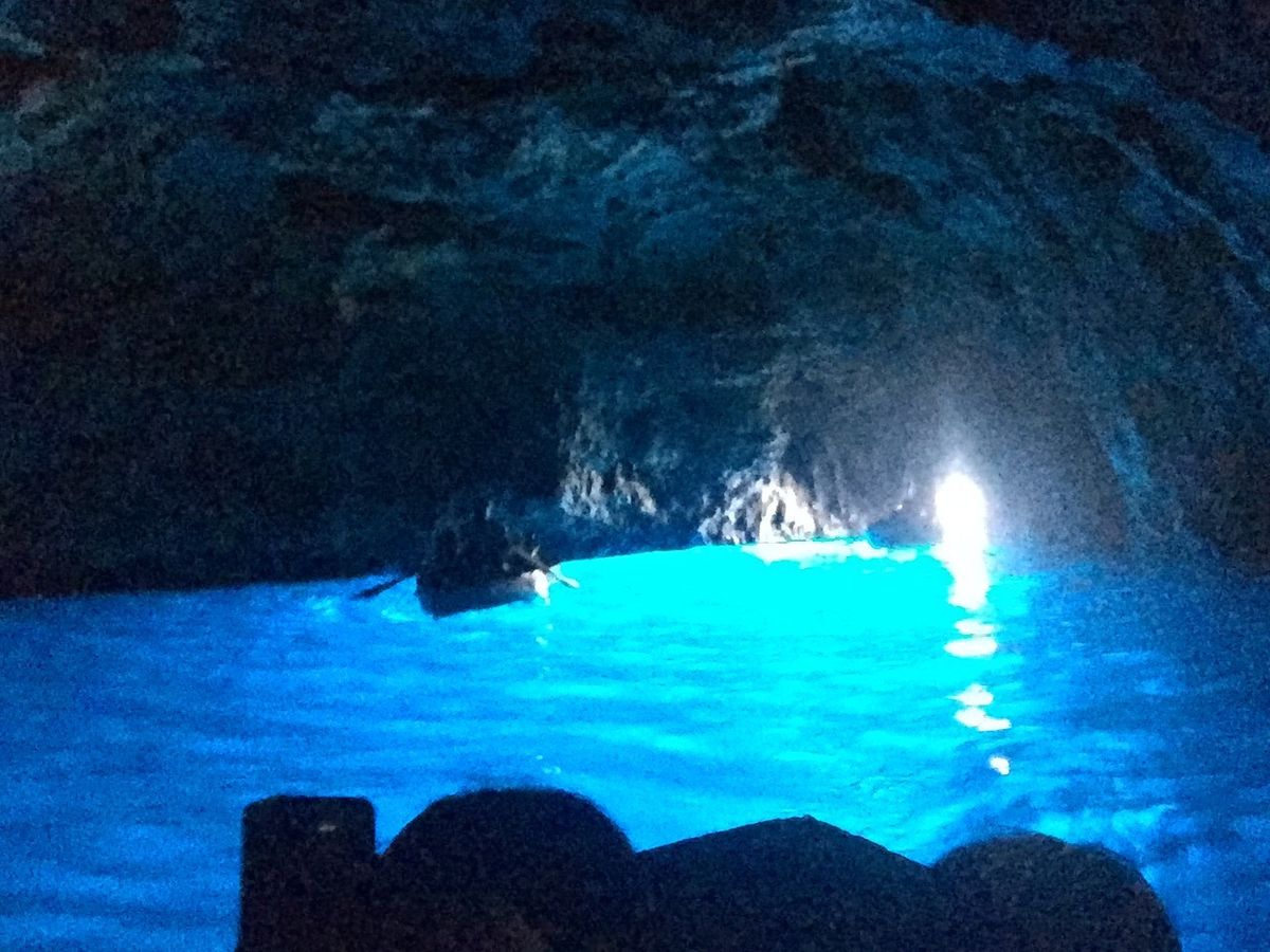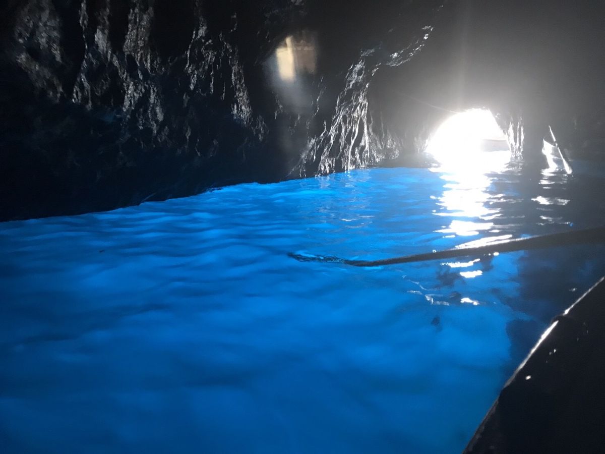知人より青の洞窟は見れないこともあるときいていたので、あまり期待せずにツアー申し込みました。大型バスの移動でいろんな国のかたは英語の女性ガイドさん、日本人だけ日本語の男性ガイドさんでのツアーです。車内は英語、日本語の説明をそれぞれ行ってくださいます。日本語の方がめちゃめちゃ情報量は多かったですけど。ナポリに着いてからは多国籍の英語ツアーの方々とは別れて日本人だけのツアーになります。ナポリからカプリの船を含めてトータル3つの船に乗車します。洞窟の前までは中型の船で洞窟に入るための手漕ぎの船に乗るための待機時間が1時間ぐらいありました。ビックリするぐらい小さな穴に船に寝そべるようにして洞窟に入ったら真っ暗です。でも後ろを振り返って洞窟入り口を見るとなんとも言えない青い光が広がっていました。