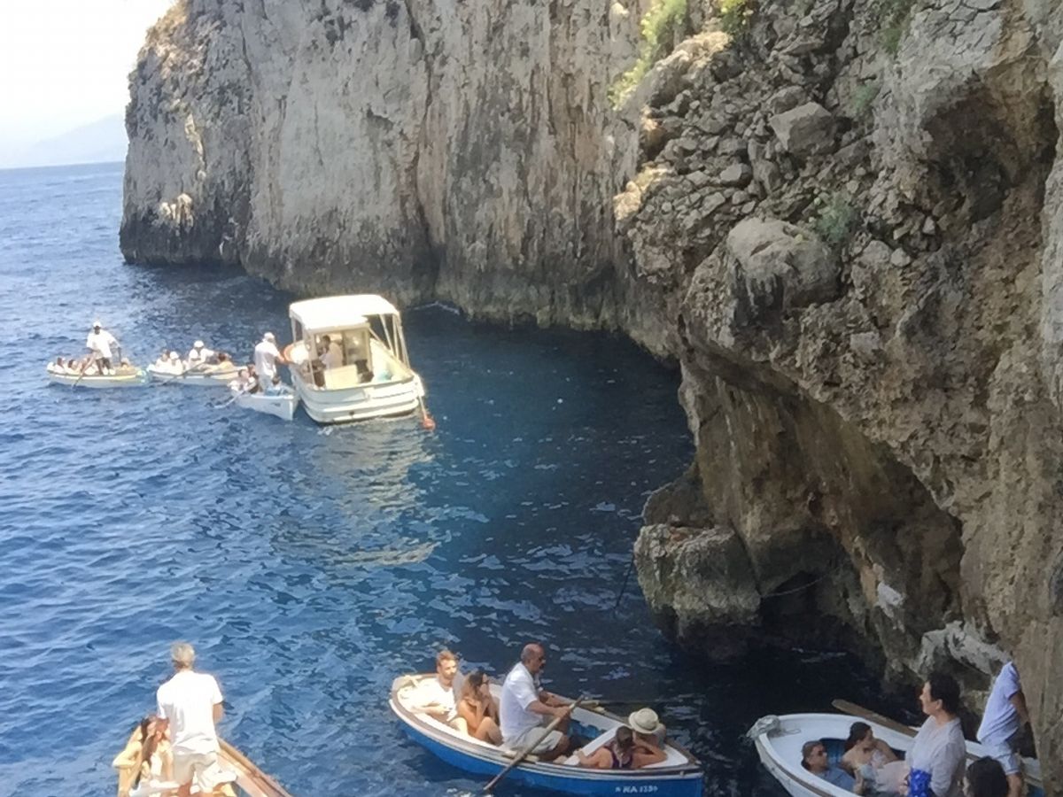 予約する際、洞窟に入れるかは天候次第となってたので、万が一入らなかった場合を想定して、ダメだった時に島散策もついているのにしました。結果的に実際、洞窟見れてラッキーでしたが、やはり、8月のハイシーズンだった為、混み合い、洞窟前での待機時間が長かったらしくカプリ島について、すぐには洞窟に向かわず(当初のスケジュールでは最初に洞窟→カブリ島昼食、散策)、島観光→昼食→洞窟の順番に変更になりましたが、添乗員の方が、臨機応変にスケジュールを組み直して、できるだけ