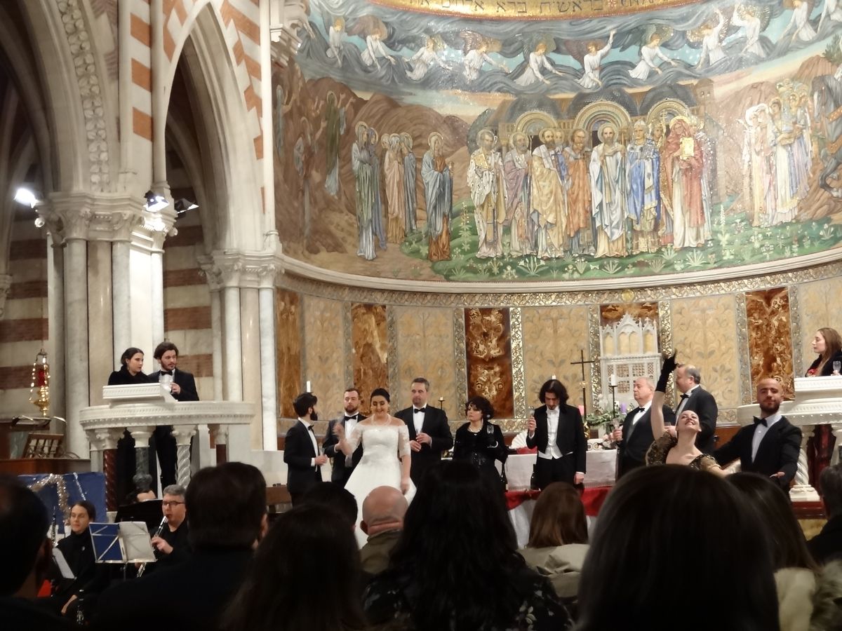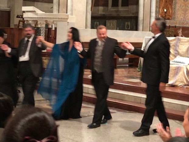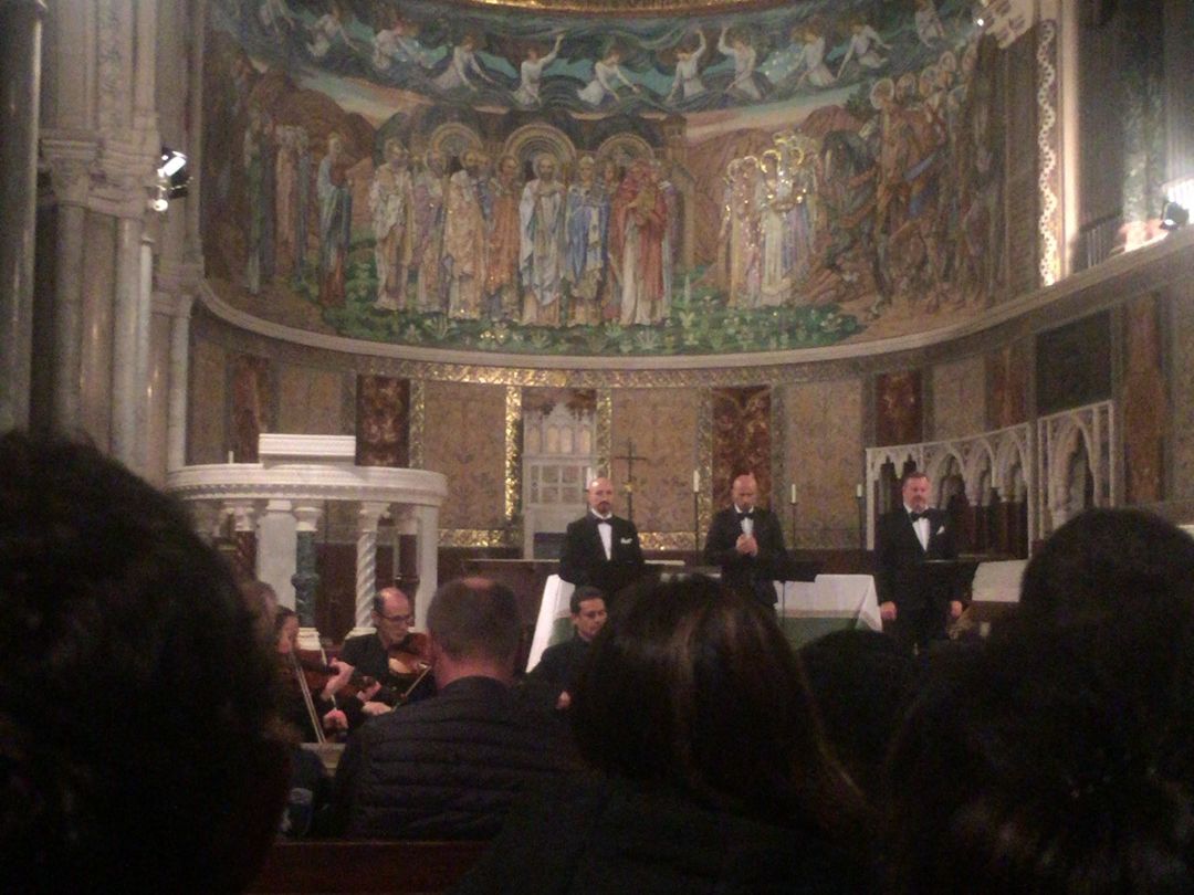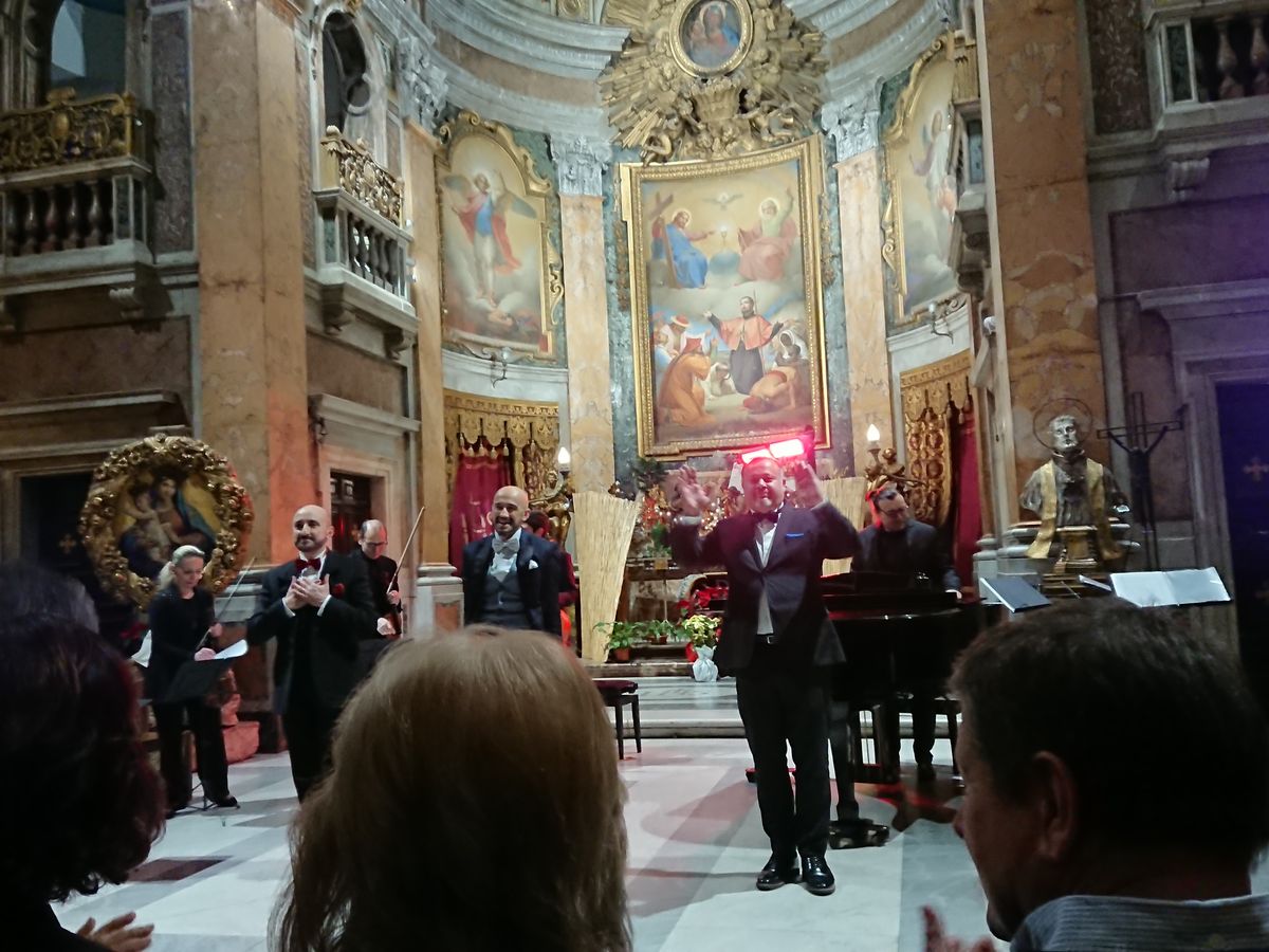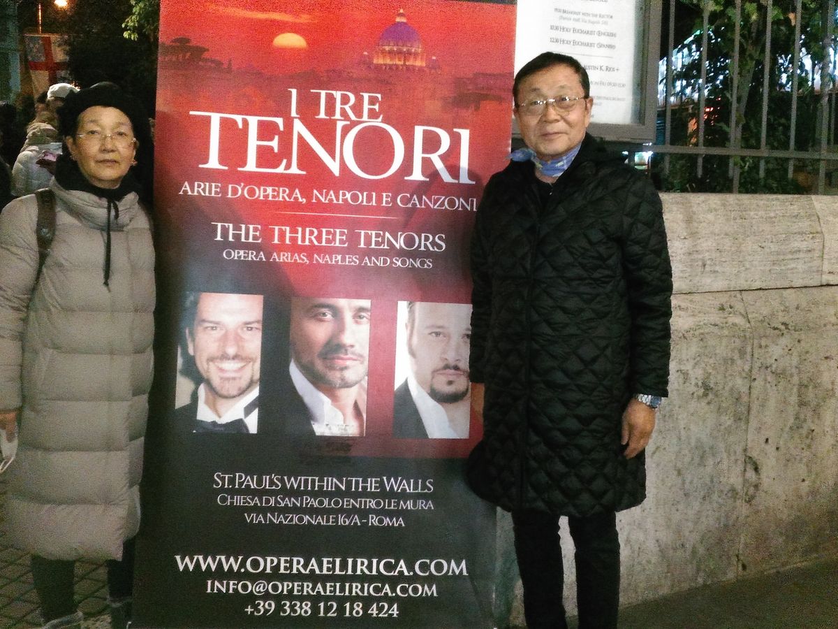 このコンサートはもおどの位になりますか?歴史があるのですよね。以前私一人でローマを訪れたことがあり その時は火曜日の椿姫と今回と同じ金曜日の三テノール・コンサートを鑑賞し 一人で感激して興奮していましたが今回は妻をエスコートしなければなりません。 先輩気取りで勇んで 街の灯が照り映える石畳の寒い夜道をリードして教会に着くことが出来ました。教会自体はあまり大きくはなく庭園も小さ目でしたが立派な大木が聳えていました。まだ30分以上時間が有りましたので 教会の入り口で写真を撮ってもらったり 周りのお店をウインドゥショッピングしました。A席の列に並んでいると若い女性が テキパキと前から4列目の席に案内してくれました。正面に宗教画が半ドーム状に上方にのびていました。ヴァイオリン、ヴィオラ、チェロ、ピアノの音が程よく教会に響きウットリと聞き惚れていました。3人のテノール歌手はそれぞれに特徴的な個性が有り 異なった声色と共に楽しませていただきました。演奏と歌が終わる毎にブラボー ブラボーでした。休憩にイタリアのリキュールが振る舞われました。増々冷え込んだ夜道も大満足の余韻と共にあっという間にホテルに到着。楽しかった。有難う。