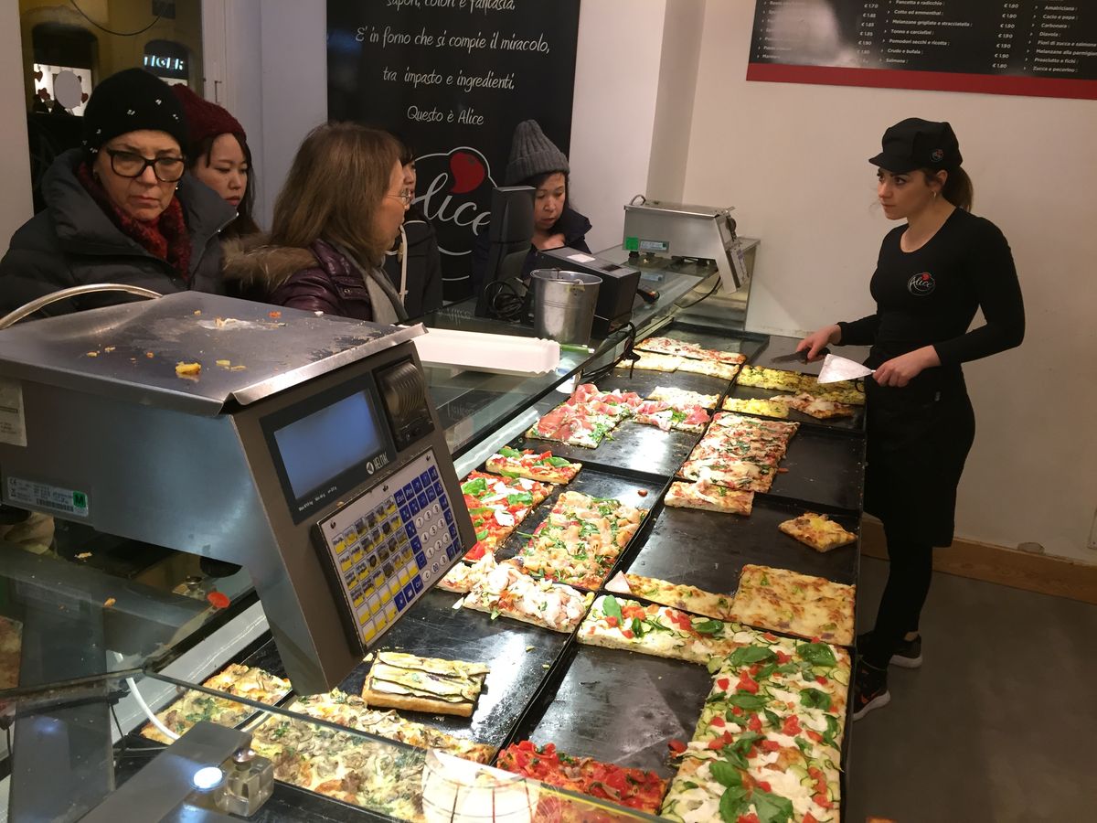 まずガイドさんが、どちら方面に行きたいかをおたずねになり、電車に乗ってツアーがスタートしました。最初にパルテノンに入って詳しい説明をして頂き、次にオーガニックのピザやさんへ、さすがに本場のピザ、沢山の種類もあって迷いましたが、ゆっくり説明して頂き、少しずつシェアして頼みました。ついでにライスコロッケも、さすが本場のピザは美味しかったです。ただ1軒目でお腹がいっぱいになったので、ジェラート屋さんに連れてって頂きました。きのどくがられて持ち帰りを持たせて頂きました。右も左も電車の乗り方も分からない私達に大変有りがたかったです。本当にお世話になりました。ガイドさんも優しく素敵な思い出が出来ました。またローマに来る事があったら、絶対に又参加します。
