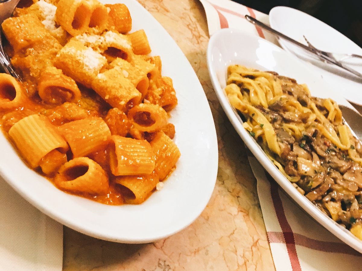 パスタも名物のフィットチーネとマカロニにトマトソースを絡めたもの?