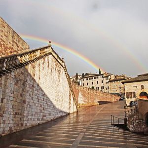 集合場所がホテルのそばでした。ガイドさんは美人の30代の女性で、英語、スペイン語も堪能、私は12歳の孫と英語ツアーに参加しましたが、多少は理解できるのであまり不便は感じませんでした。圧巻はオルビエイトでしたね。雨模様でしたが、近づくにつれ晴れ、中心部にある教会を見たときにこれまで経験したことのない尖塔モザイク模様には圧倒され、思わず美しいと、そして眼下に広がる景色に感動しました。アッシジは時々雨が降りましたが、帰り際、私の洗礼名に結びついたのか二重虹がかかりました。