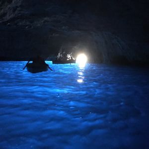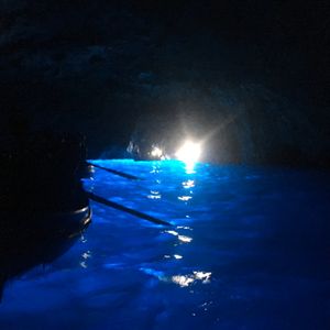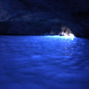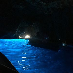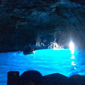 知人より青の洞窟は見れないこともあるときいていたので、あまり期待せずにツアー申し込みました。大型バスの移動でいろんな国のかたは英語の女性ガイドさん、日本人だけ日本語の男性ガイドさんでのツアーです。車内は英語、日本語の説明をそれぞれ行ってくださいます。日本語の方がめちゃめちゃ情報量は多かったですけど。ナポリに着いてからは多国籍の英語ツアーの方々とは別れて日本人だけのツアーになります。ナポリからカプリの船を含めてトータル3つの船に乗車します。洞窟の前までは中型の船で洞窟に入るための手漕ぎの船に乗るための待機時間が1時間ぐらいありました。ビックリするぐらい小さな穴に船に寝そべるようにして洞窟に入ったら真っ暗です。でも後ろを振り返って洞窟入り口を見るとなんとも言えない青い光が広がっていました。