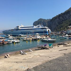 混み混みで、カプリ島に着いたら船は出払っており、陸路(マイクロバス)にて洞窟の入り口近くまで移動しました。マイクロバスでの移動は、車窓から良い景色も見られ、問題なかったです。が、洞窟への小舟に乗るまでは行列で1時間半ほど並びました。待ち疲れましたが、洞窟に入れたし、青の洞窟自体は感動的でした。