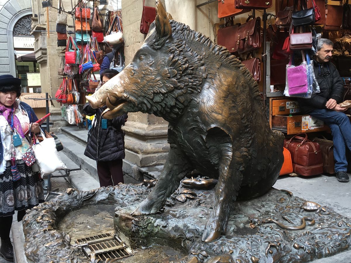 テルミニ駅では、10分前までホーム番号が掲示されませんでした。構内のカフェで朝食を購入し乗車。時間通りに到着。駅からすぐ近くの集合場所で待っていると、ガイドさんが声をかけてくれました。時間前に徒歩で観光スタート。通り沿いに歩き、洗礼堂・ドゥオーモを横目に新市場のイノシシへ。鼻を触りコインのお呪いをして、ベッキオ橋へ。朝はまだ空いていない店もあり人も少なくゆっくり見て回れました。渡らずに引き返し、ヴァザーリの回廊の下からウフィツィ美術館前を抜けてシニョリーア広場へ。ダビデ像、ヴェッキオ宮、ネプチューン噴水を見てドゥオーモ観光へ。終了後解散し、近くでショッピング、サンタマリアノベッラ広場のカフェで昼食をたべました。(半日では短いので、じっくりフィレンチェを見て回るなら午後は自由に回る方がいいかも。)同じ集合場所で午後のピサ観光に出発。ガイドさんとバスで出発。駐車場から約30分ほど歩いてピサの斜塔へ。入場まで30分ほどの自由時間は近くのお店で休憩。斜塔へはカメラや飲み物以外の荷物は持ち込めません。階段も傾いていて、すり減っているので、登るとき変な感じです。上からの展望は圧巻です。帰りもひたすら歩いてバスでフィレンチェへ戻りました。ローマへの帰りは最終の便にしておいたので、サンタマリアノベッラ薬局などで買い物をしてタクシーでミケランジェロ広場へ。夕景の街を眺めて、待たせておいたタクシーで駅まで帰り(30ユーロ)、新幹線でローマへ。帰りも時間どおりでした。