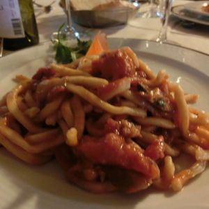 ランチは、地元名物の太麺パスタと白毛牛のソテーなどのコース。ポルチーニ茸とサルシッチャのトマトソースはパスタによく合っていました。