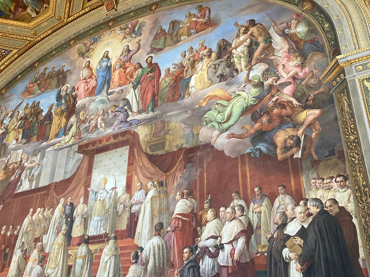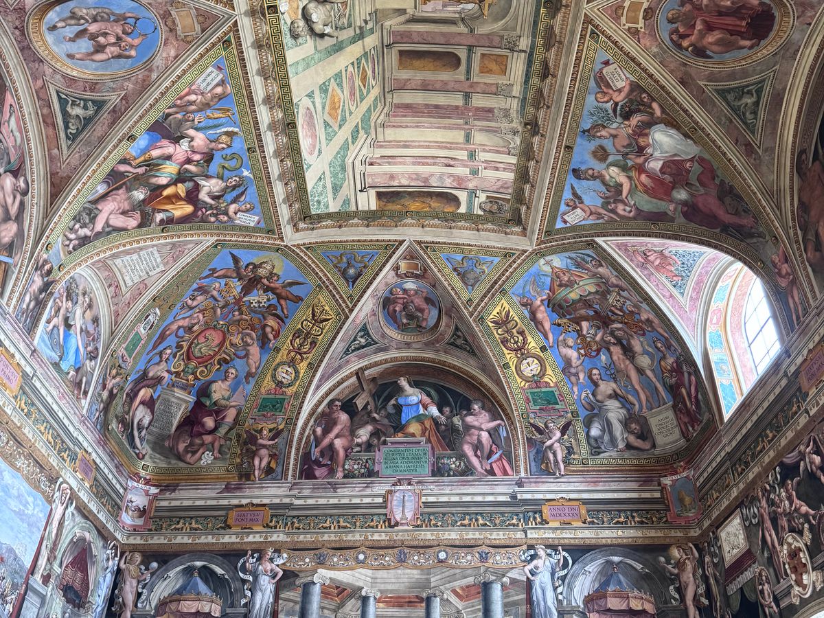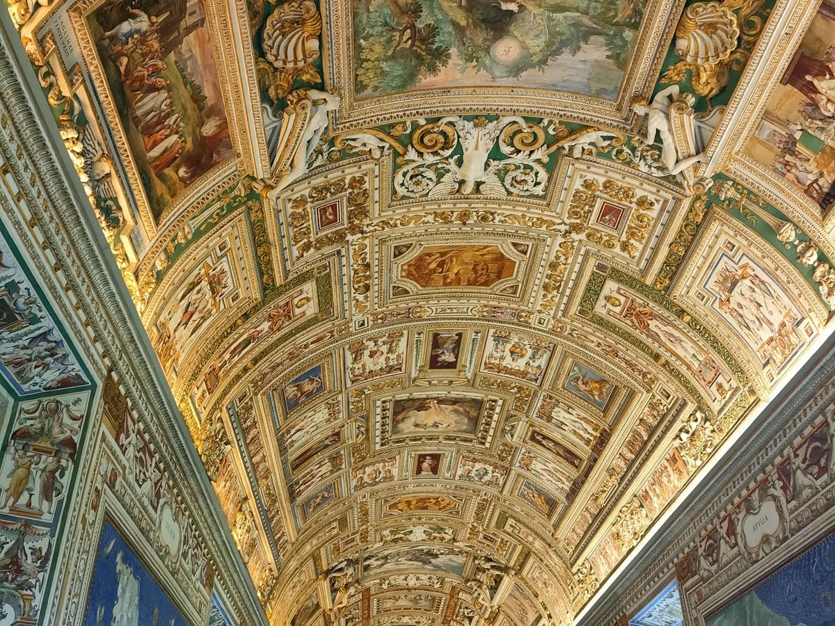 バチカン市国の北東側から入国し、荷物検査などを通過して、コースに沿って各部屋に入って絵画を見たり、システィーナ礼拝堂の天井画を見たりという感じ。
