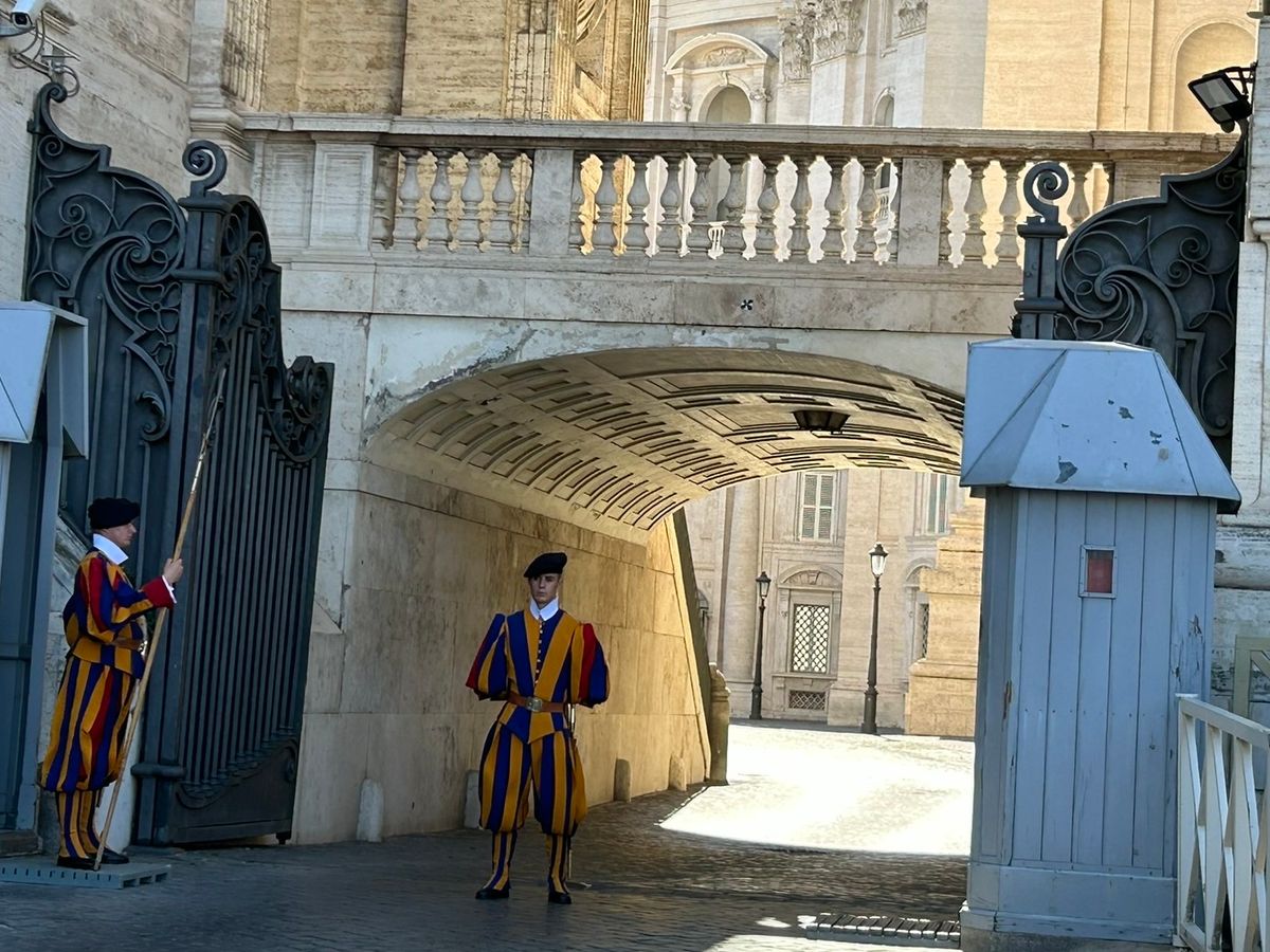 システィーナ礼拝堂を抜けると特別なルートでサン・ピエトロ大聖堂の入り口まで案内していただき、そこで大聖堂での見どころを少し解説していただいた後で解散となりました。途中でスイス衛兵にも会いました。