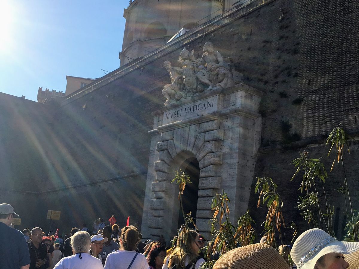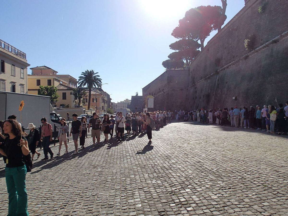 チプロ8時集合でバチカンまで歩いて数分、しかし、予約した人ばかりの長蛇の列で実際に入口にたどり着いたのは9時45分でした。折しもパリ45度を記録した時でローマも34度の日でしんどかった。日傘はヨーロッパではささない習慣なので持っていきませんでしたが悔やみました。予約でこれなら予約なければまず入れないのではないかと思います。しかし、待ってる間もイタリア人の女性ガイドさんのお話で飽きることはありませんでした。バチカンは月曜日は休日明けで大混雑だそうなので、予約するなら別の日をお勧めします。ラファエロの間まで行くツアーでしたがそれにして良かった。大混雑ながらも詳しく説明が聞けました。ガイドさん最高でした。