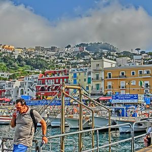 カプリ島では、青の洞窟にバスで行く方法以外に船で行く方法もあり、洞窟入り口では陸からも海からも待つ人がたくさんいて、洞窟に入るための小さいボートを操縦する人と交渉できないとずっと待たされそうな状況でした。