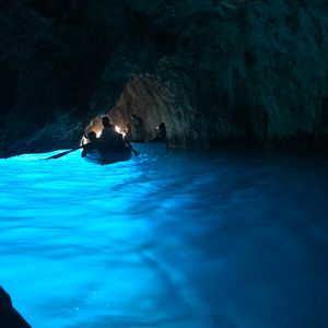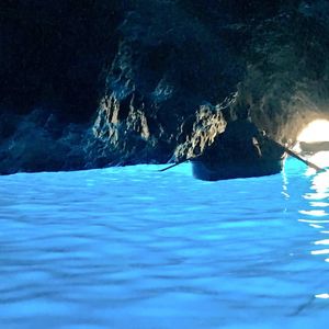 行きは渋滞のせいでカプリ島に到着したのは予定より1時間ほど遅かったです。到着してすぐ山の上にバスで向かい、青の洞窟に待ち時間なしで速攻で入ることができました!小さな船に2人×2組と船頭さんの計5人で洞窟内に入りました。事前に口コミを見ていたのでチップも準備しておきました。ガイドさんには2人で5ユーロくらい渡せばOKと言われていたのですが、船頭さんには「写真撮影、歌を歌う、洞窟を3周で10ユーロ」と言われ予想よりも高かったけどそれで了承し、いよいよ洞窟の中へ。同じ船に乗ったもう1組のカップルはどうやら了承しなかったようで写真撮影等はなかったです。でも同じ船なので歌と洞窟3周付き。少し不公平な気がしました(笑)洞窟内は本当に綺麗で幻想的な空間でした。