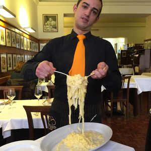 今回のローマでは絶対美味いイタリアンを家内と堪能したいと思い、1年ほど前にTVで見た高田さん・向井さんのイタリア紀行で紹介あったレストランが気になって探していたのですが、ラッキーにも、バッチリ、ベクトラでヒット、即予約し、行ってきました。TVで見た通り、店内は政治家、映画スター、、、著名人の写真で飾られ、否応なしに気分は盛り上がり、、、まずアペタイザーとしてチーズとハムがサーブ。さすが本場での味で満足。次は本家フィットチーネの番、とろけるチーズとパスタのハーモニーが抜群。量も満足いくものでした。メインはパスタほど期待していなかったのですが、自分のビーフも家内のチキンもOK、最後のデザートも満足できる味でした。TVで紹介された、特に観光地のレストランはがっかり、ってのが多いと思いますが、このレストランは裏切りません。フルボトル1本付きで、店の雰囲気に酔い、フィットチーネに酔い、ワインに酔い、コンドッティ通りを散策し、、、、家内も自分も大大満足の1日でした。