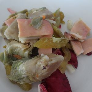 ランチはポンペイ近くのベスビオという名のお店でしたが、ピザ一切れ、パスタ、メイン(魚か肉)、デザートのミニコースでまあまあの味でした。飲み物は別料金です。