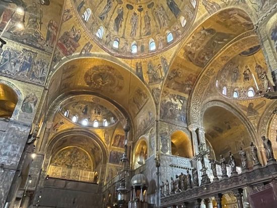 壮大なビザンチン様式の美しい外観を眺めたら、早速教会内部へ。天井一面に広がる黄金のモザイク画や数千個もの宝石を埋め込んだ祭壇の黄金の衝立など、贅を尽くした煌びやかで華麗な空間は一見の価値あり!90mを超える高さの鐘楼にはエレベーターで昇ることができ、ヴェネチアの街を一望できます。