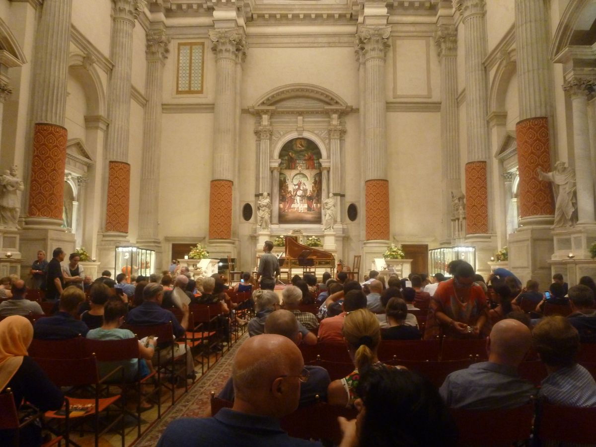 教会の場所はヴァポレットのアカデミアから、橋を渡ってすぐのところでわかりやすかったです。9時開演で8時30分には教会につきましたが、すでに長蛇の列。センターブロックのよい席に座りたければ、もっと早くから並んだほうがよいでしょう。早めに開場になって、すぐに満席になりました。夏のピークシーズンだったからかもしれません。