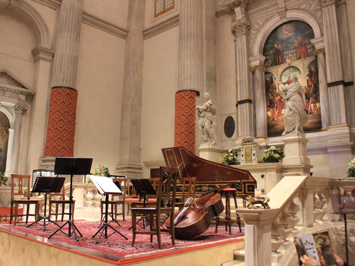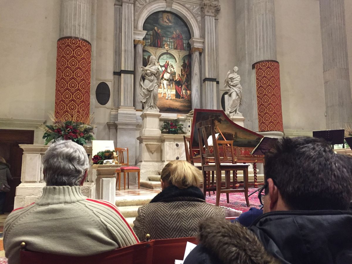 ヴェネツィアは何度も行っていますが、室内合奏団のコンチェルトを見たのは初めてでした。昼間のうちにアカデミア橋の近くのサン・ヴィダル教会を見ておきました。人のいないところで教会の内部に展示された楽器をゆっくり見ておくのもよかったです。(コンチェルト後は人でごった返してます) 行ったのは8時過ぎ。すでにある程度は並んでいましたが、ほぼ中央のかなり前の方で見ることができました。最後の方に来た人は、サイドのいすに案内されていました。満員だったと思います。偶数日・奇数日で演目が違い、やはり「四季」の演目の入っている日は混んでいるのでしょう。演奏はすばらしく、観光客のほか地元の人たち(と思われる)もかなりカジュアルな雰囲気で楽しんでいました。また見たいと思います。