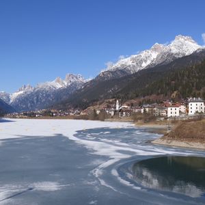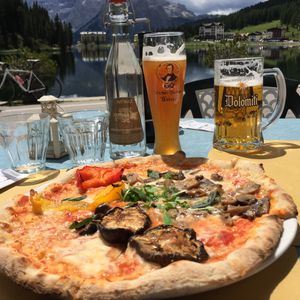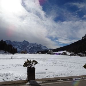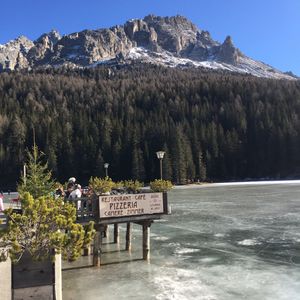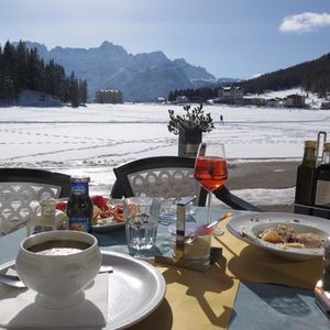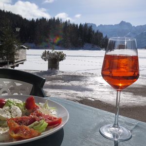 そして、ミズリーナ湖。2月だったため湖全体が凍っていて湖の上をお散歩している方もいました。息をのむほどに見事な山々が連なりユネスコ世界遺産であることが頷けます。ミズリーナ湖の目の前で頂いたお食事は最高でした。美しい景色、気持ちのいい空気、おいしいイタリアン、そしてイタリアのApreol Spritzカクテルと五感がすべて刺激された感じです。