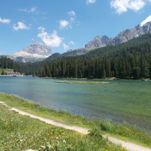 私達と夫婦3組の8人でボックス車で出発しました。途中テイッツアーノの故郷で休憩して、ジェラードアイスを食べてミズリーナ湖でランチでした。その間二か所の写真スポットで下車しての説明があり、迫るドロミテを体感できるドライブでした。欲を言えばランチのレストランが混んでいたため50分の自由時間に散策ができなかったのが少し残念でした。夏休みの道路の混雑もあり、時間がいつもよりも取れなかったのだと思います。