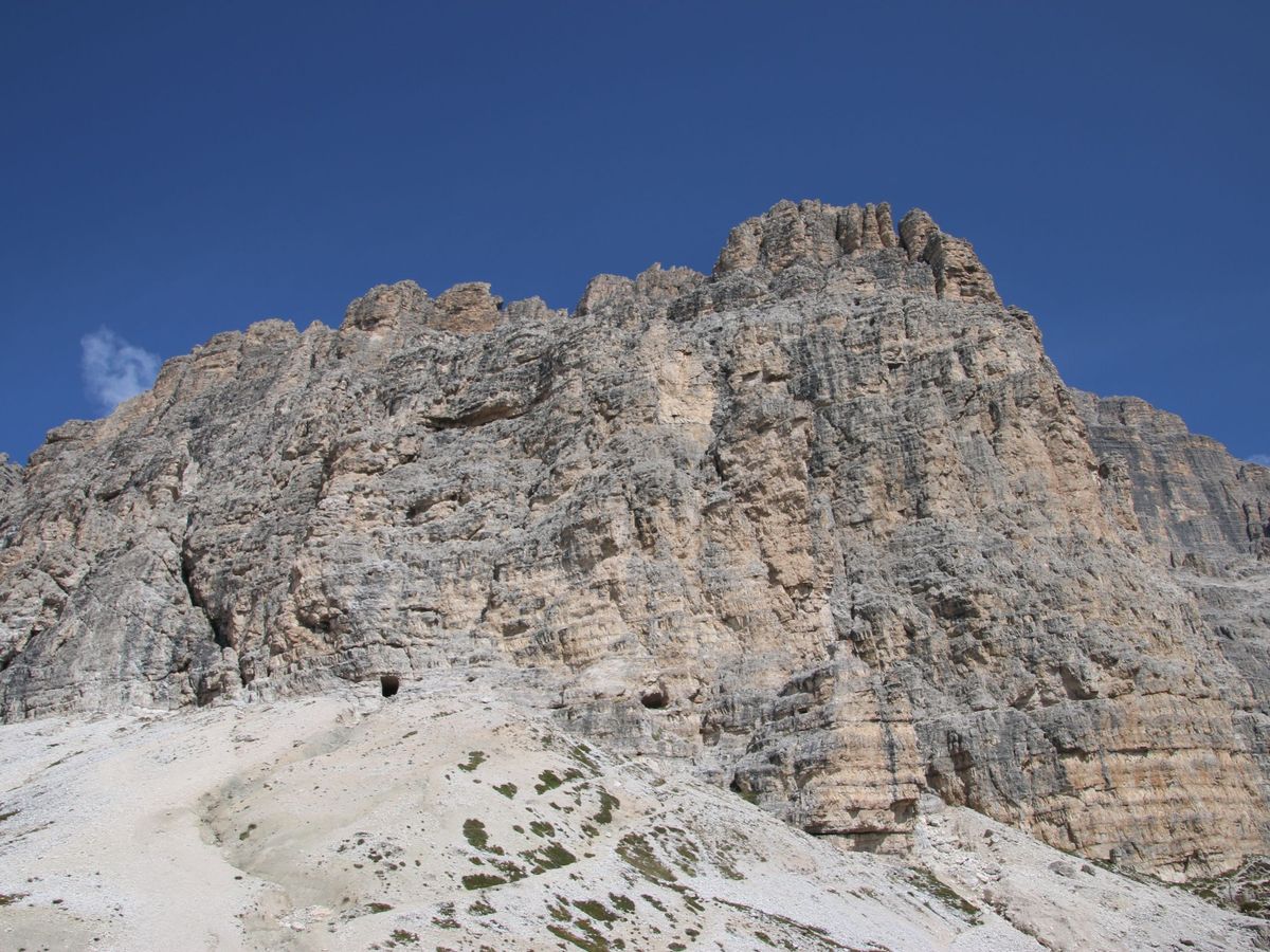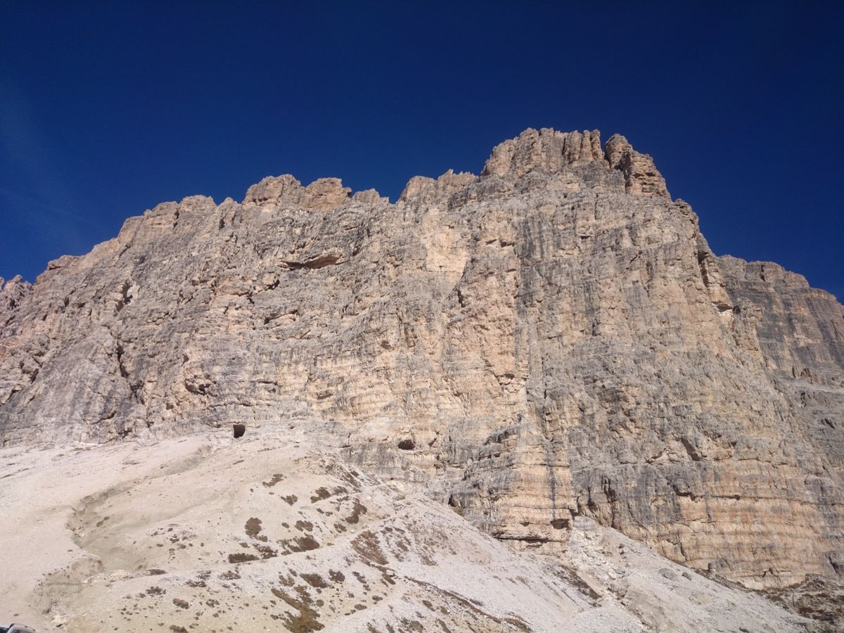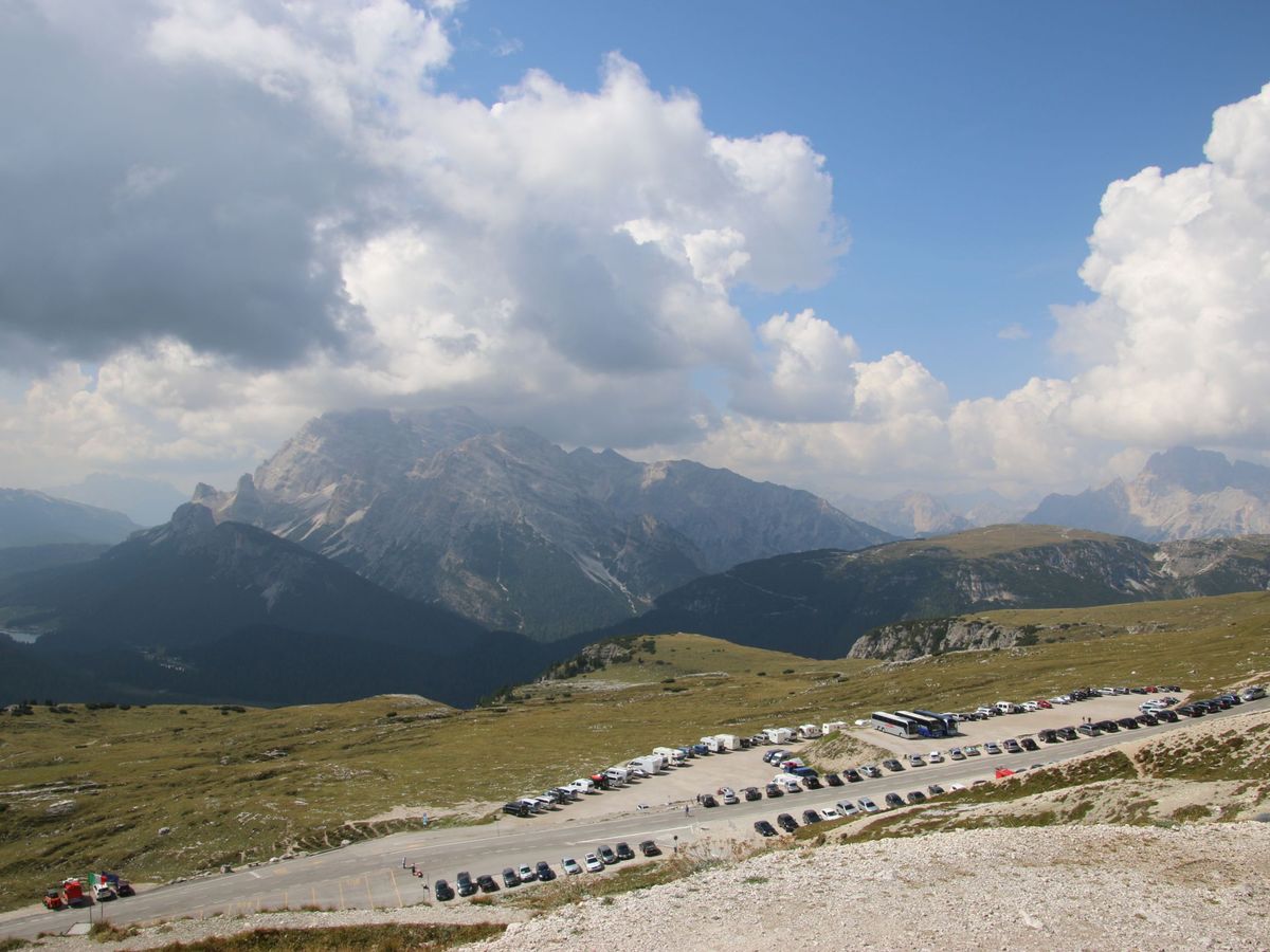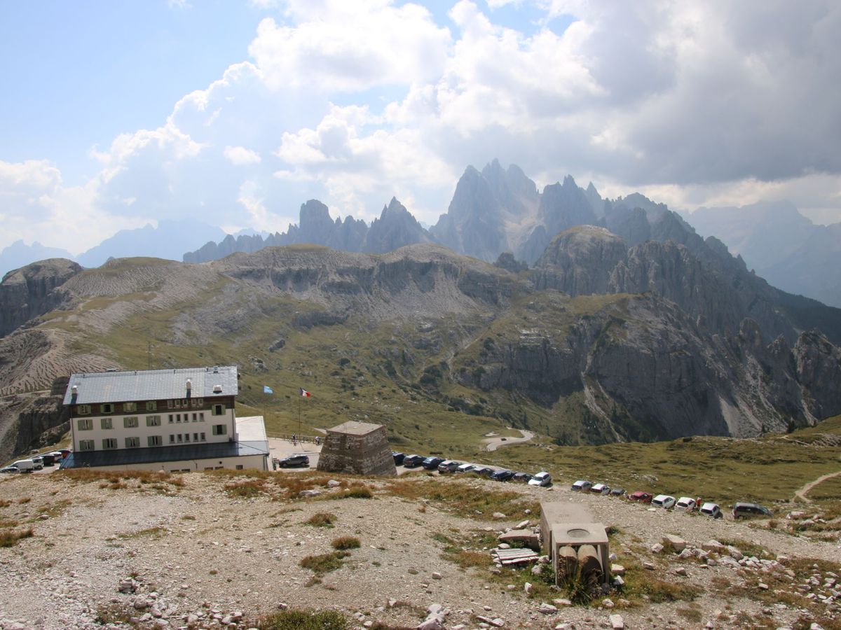 12時半頃トレチーメを間近で見上げることができる2300メートル付近の駐車場に到着、ここからの風景は世界遺産だけあって圧巻、絶景そのものだった。グレーの岩肌が印象的な奇岩の山々、麓の針葉樹の森と田園風景が織りなす濃淡様々なグリーン、晴天の青空とのコントラストは、一生忘れられない風景となった。晴れてはいたが気温が低く風もあり、サマーセーターの上に薄手のコートを着て丁度良かった。