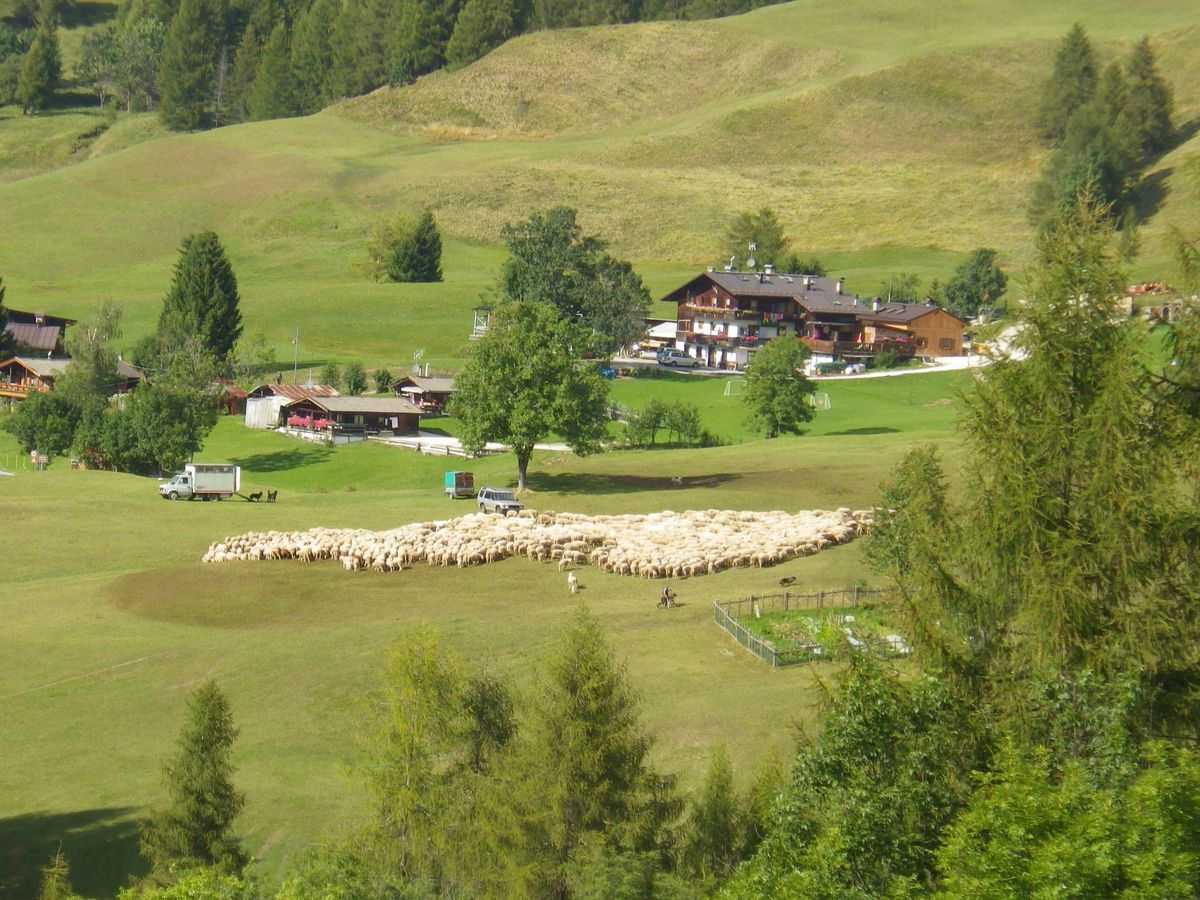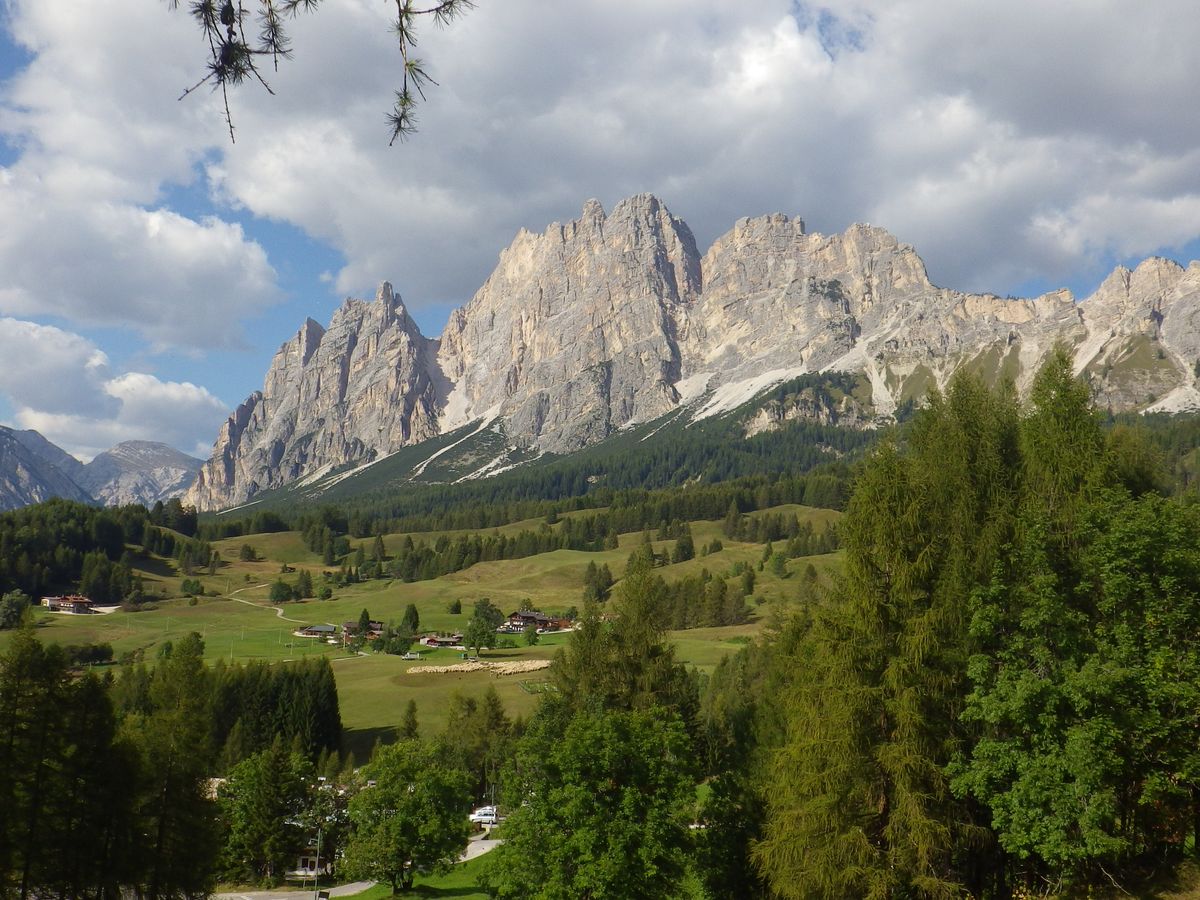 またコルティナに行く前に止めてくれた場所は、遠くに数十匹の羊の群れと羊追い犬が走り回る様子が見え、皆喜んでいた。雄大な山並みと、のどかな牧草地とかわいい小さな村が素晴らしい風景だった。
