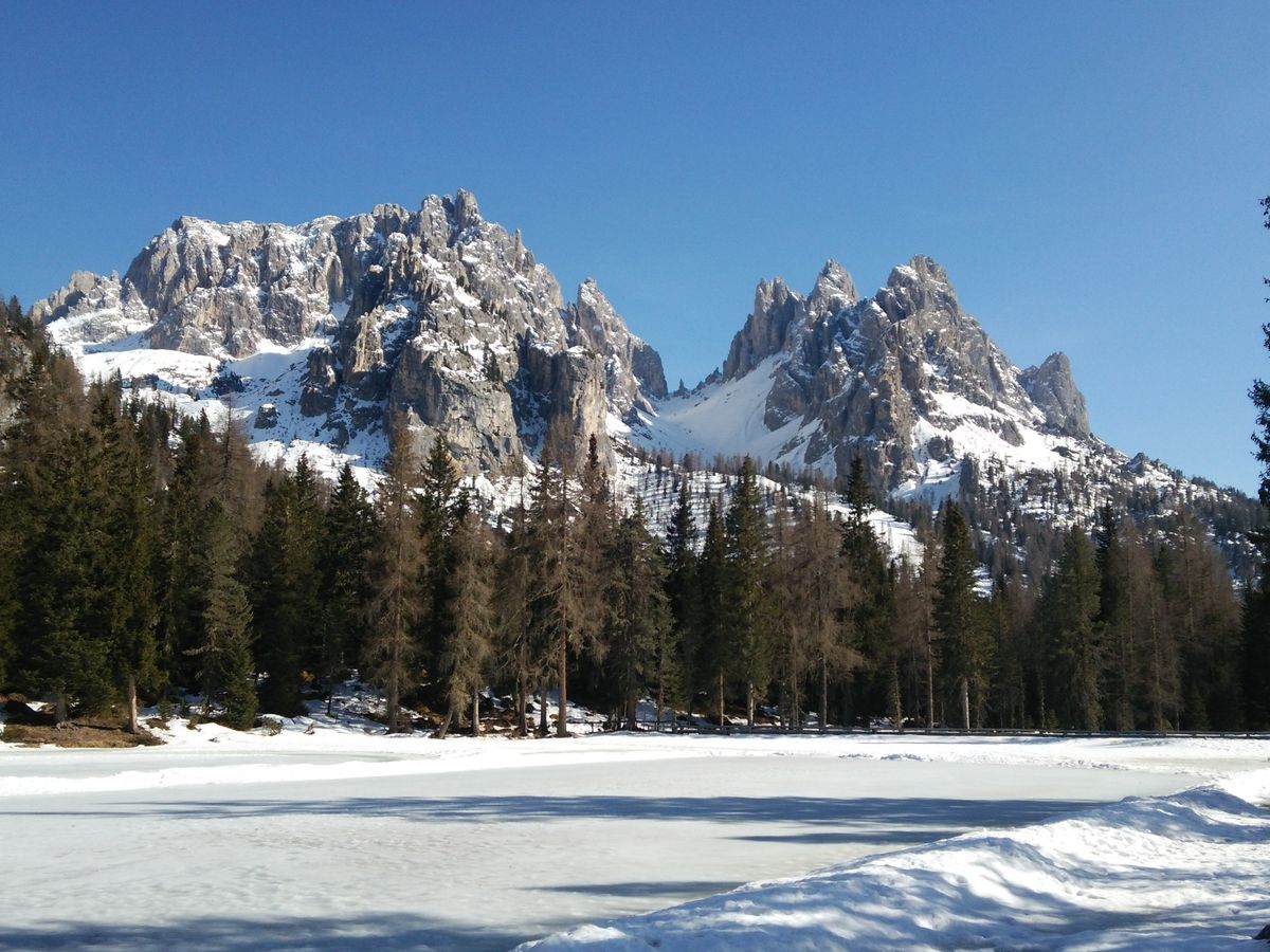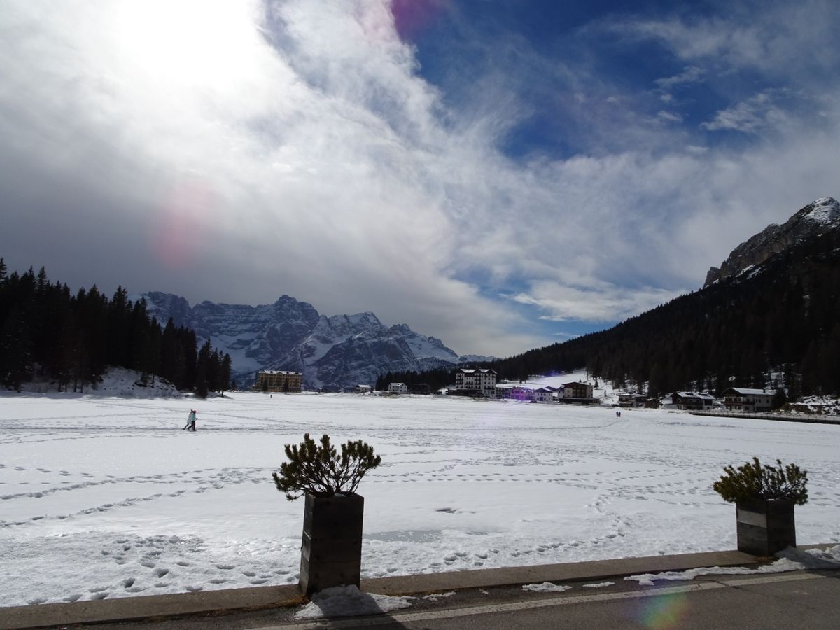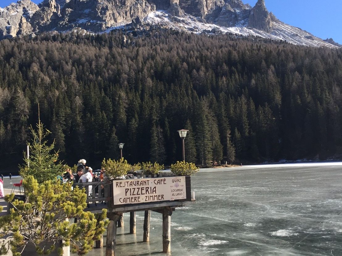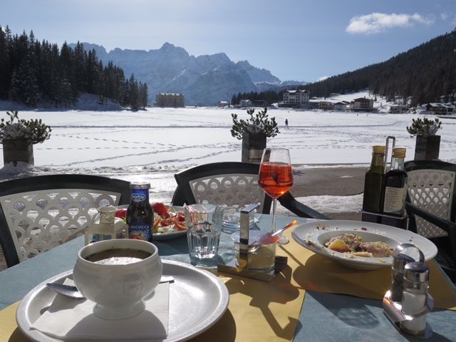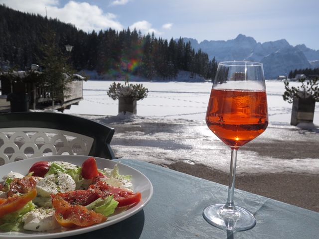 そして、ミズリーナ湖。2月だったため湖全体が凍っていて湖の上をお散歩している方もいました。息をのむほどに見事な山々が連なりユネスコ世界遺産であることが頷けます。ミズリーナ湖の目の前で頂いたお食事は最高でした。美しい景色、気持ちのいい空気、おいしいイタリアン、そしてイタリアのApreol Spritzカクテルと五感がすべて刺激された感じです。