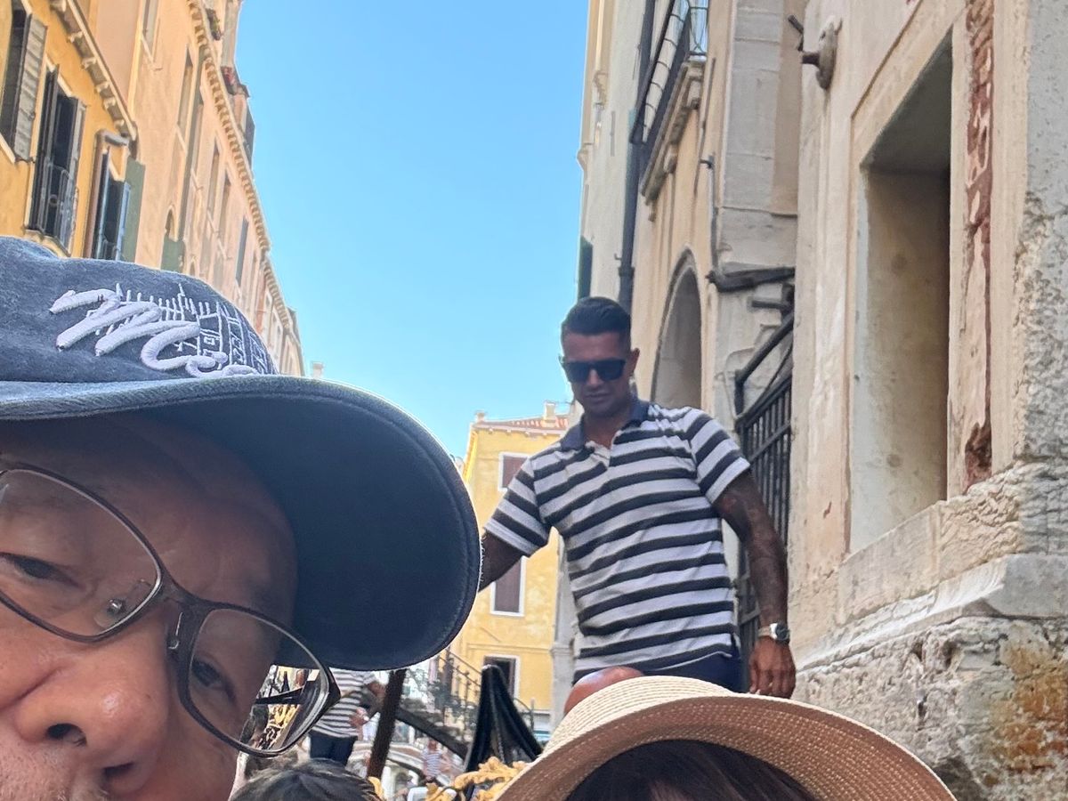 集合場所からゴンドラ乗り場まで、スタッフさんの説明をイヤホンで聴きながら歩きます。ゴンドラへは、アメリカ人の姉妹の方との混載でした。写真を撮りあったりして楽しかったです。ゴンドリエーレの方も歌を歌ってくださったり操船技術を観せてくださりと楽しませてくれました。