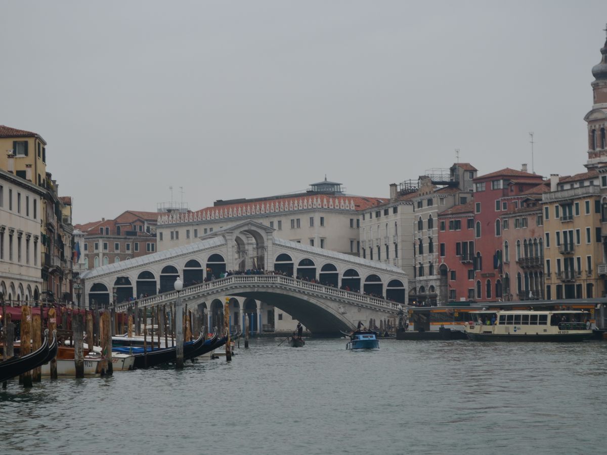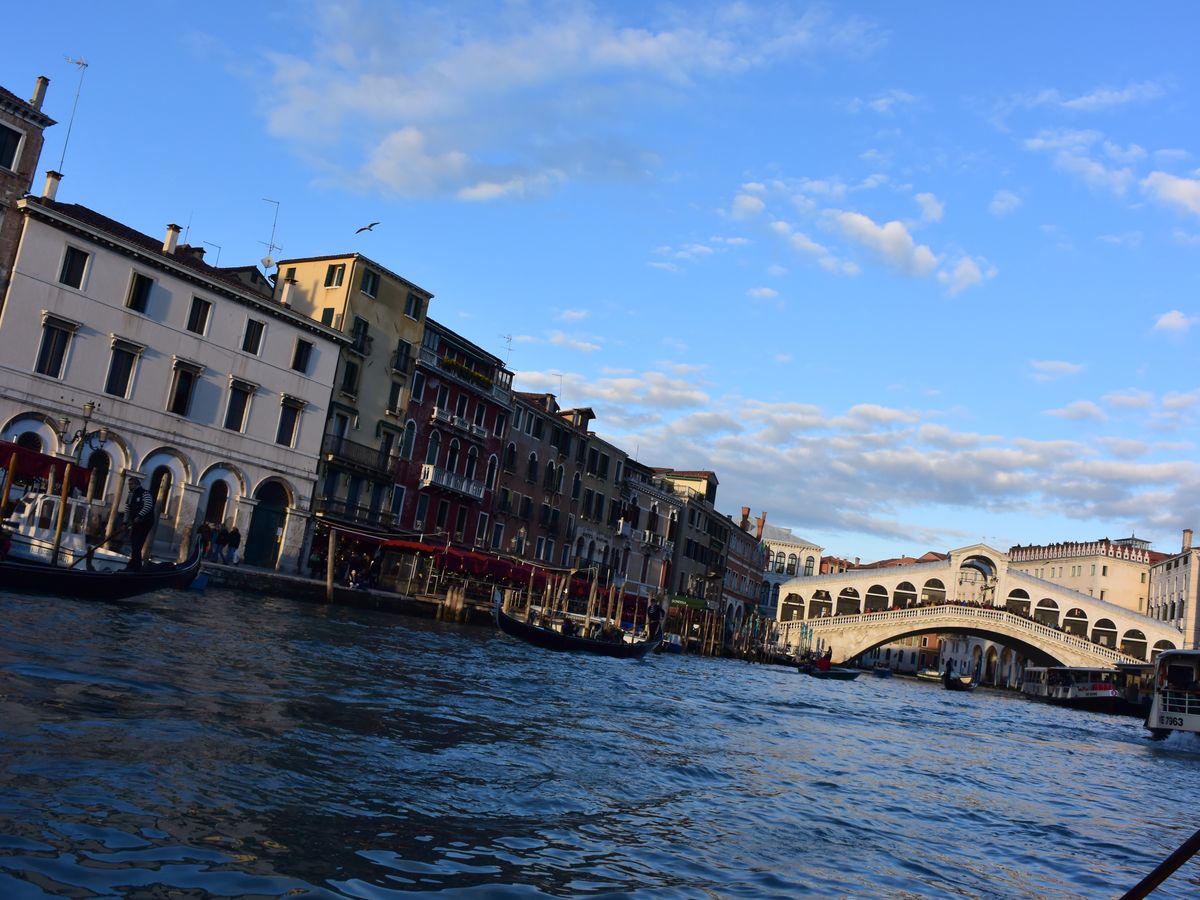 ゴンドラは巧みに舵取りしながら、水路を壁すれすれに進みます。それからリアルト橋が見える少し大きめの運河に出て、また元の発着所に戻ります。リアルト橋の見える運河に出たときは、これぞヴェネチアという景色で必見です。また、多数のゴンドラら遊覧船も行き来しており、その魅力をさらに引き立てていました。