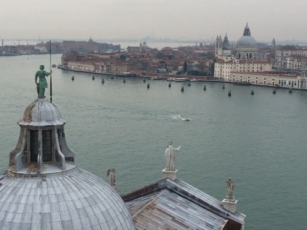 エレベーターで鐘楼に登ると360度の眺望。運河越しに本島の全容、反対には美しく延びるリド島と美しく弧を描くジュデッカ島を見ることが出来る。リド島はヴェネツィア国際映画祭が行われるとのこと。こうして島を見ると映画祭での賞のすごさを強く感じることが出来る。