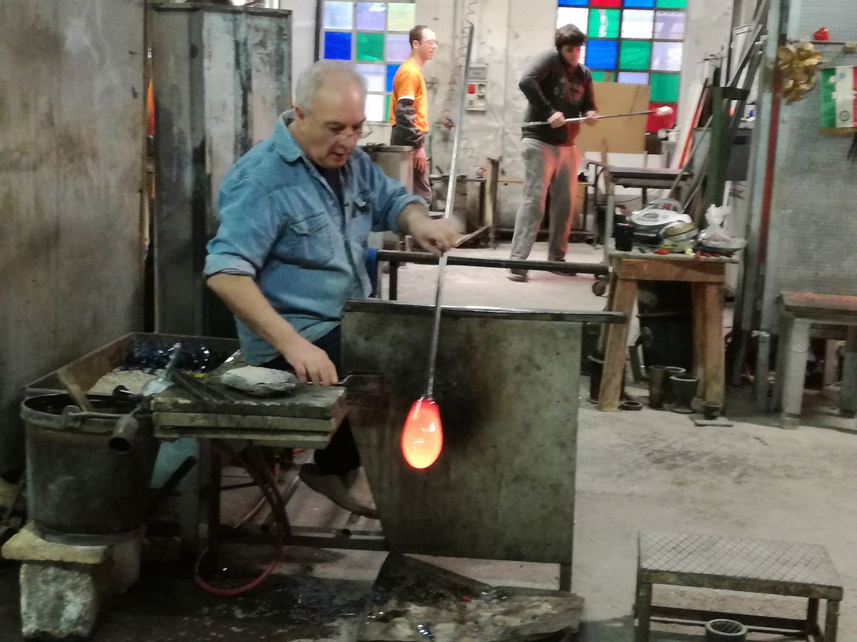 ガラス工房で制作デモを披露してくれました。