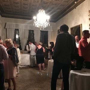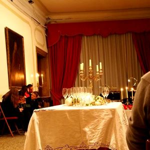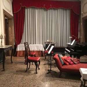 場所の検索をするとカナル・グランデ沿いに入り口があり、心配だったので明るい時間に、「Musica a Palazzo」の下見をしました。と言ってもわかりにくかったのですが、会場の時間間際になったら、案内の張り紙が出ていたので、助かりました。ドレスコードはカジュアルでしたが、中にはフォーマルのドイツ人のおばさまがたもいらっしゃいました。(浮いてましたが。。。)受付を済ませ、中に入ります。その日は「椿姫」のオペラを見ました。観客は場面ごとにお部屋の移動をし、雰囲気を味わうことができます。ほぼ満席でしたが、自由席なので好きなところに座れました。オペラは、観客とステージが一体化なので、目と鼻の距離でアリアを楽しむことができます。一流のオペラファンでしたら、違った良さに気がつかれると思います。