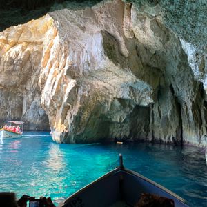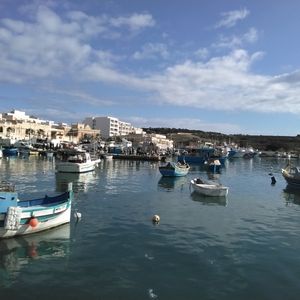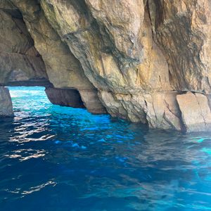 英語とドイツ語でツアーが行われました。マルタ在住のオランダ人のガイドさんがマルタの経済事情など様々なことをずっと説明してくれ、とてもおもしろかったです。また、同じようなバスがたくさん並んでいるので、バスの番号をRemindしてくれたりと気配りもありました。青の洞門では、「時間までにバスに戻らなかったら、ここにずっといるとみなし置いていていきます」ということでしたが、別のお客さんが「また戻っていない老夫婦がいる」とガイドさんに言うと、ちゃんと探しに行き待っていてくれました。マルサシュロックでは大雨に降られ、青の洞門に入れませんでしたが、代わりに付近の街を散策。とても楽しかったです。ちなみに、マルサシュロックは写真ほどカラフルではありません。また、青の洞門には別の日に行きましたが、コミノ島でのボートツアーと海の青さも内容もほぼ同じです。