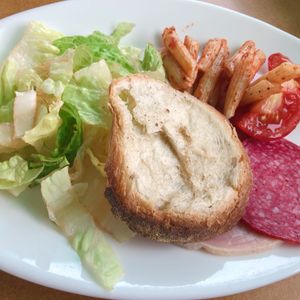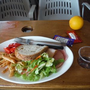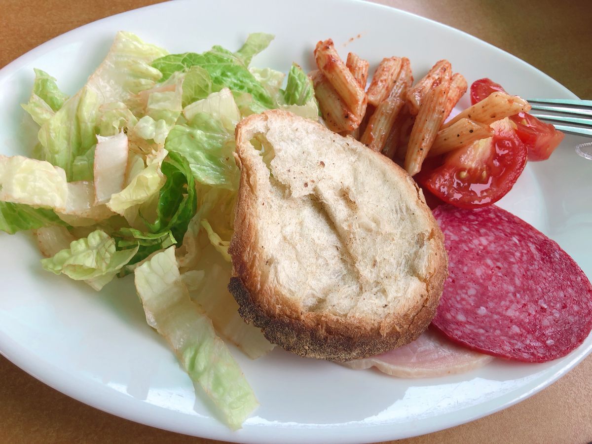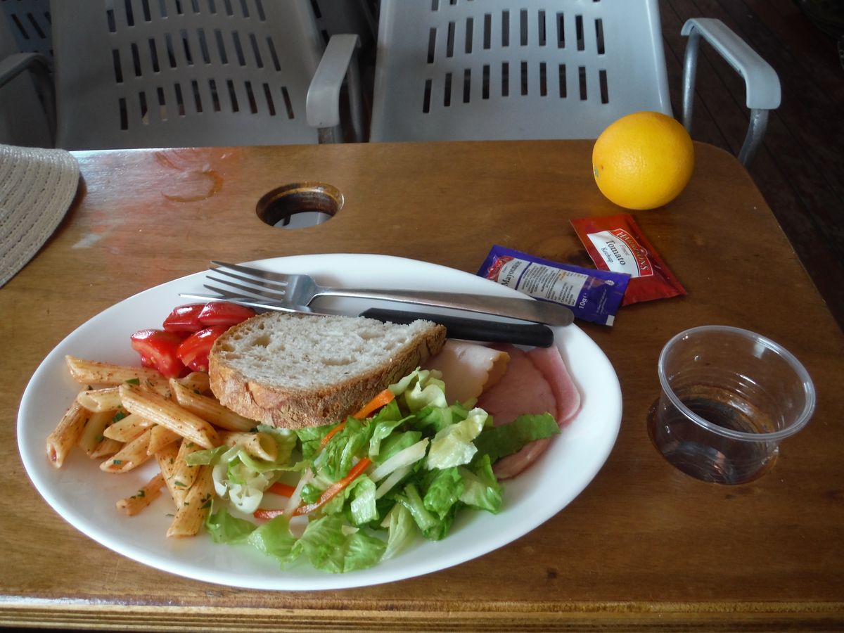 常温に晒されたハム達3枚、切り口が既に変色しているキャベツ、大丈夫そうなトマト2切れ、味の薄いパスタ少量。あとはパンとフルーツ(確かオレンジ)も自由でしたが、パンにつけれそうなものがマヨネーズしかありませんでした…